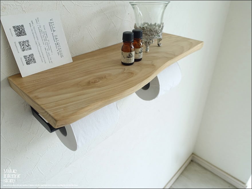 耳付きのチーク材の棚板が素敵な2連式のトイレットペーパーホルダー。ペーパーの設置も横からサッと通すだけで、棚板にはお気に入りのインテリア小物やグリーンなどを飾っていただけます。あなただけのプライベートルームづくりにぜひお役立てください。