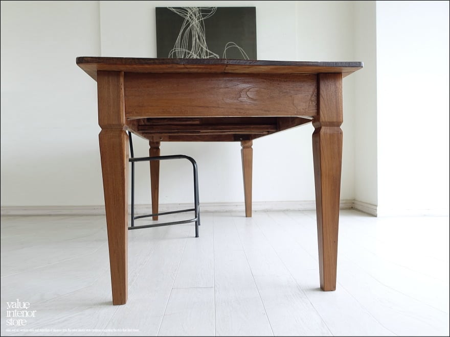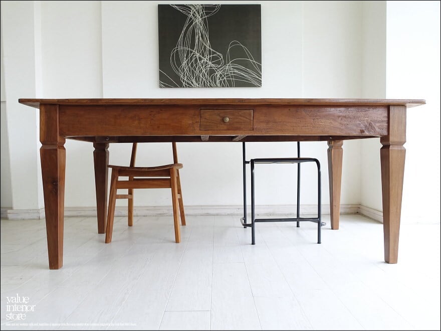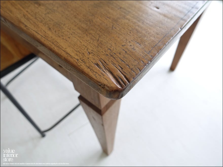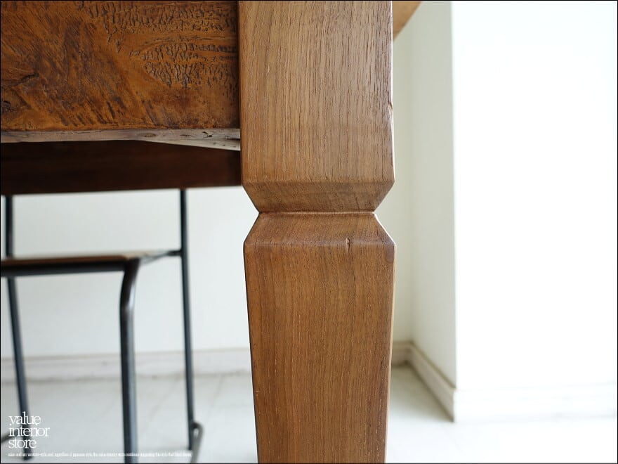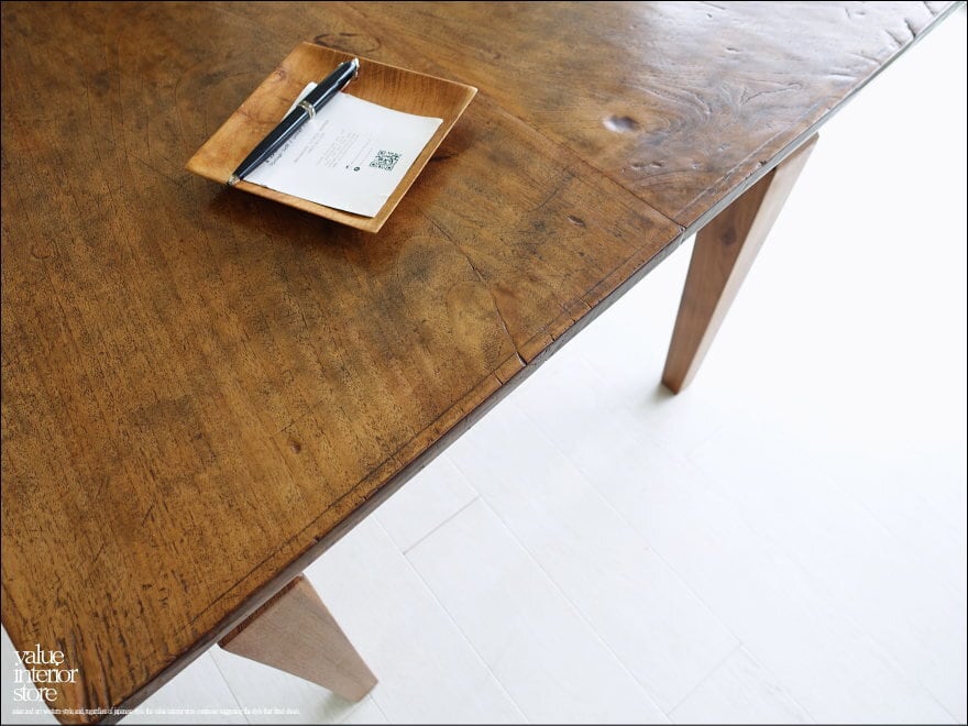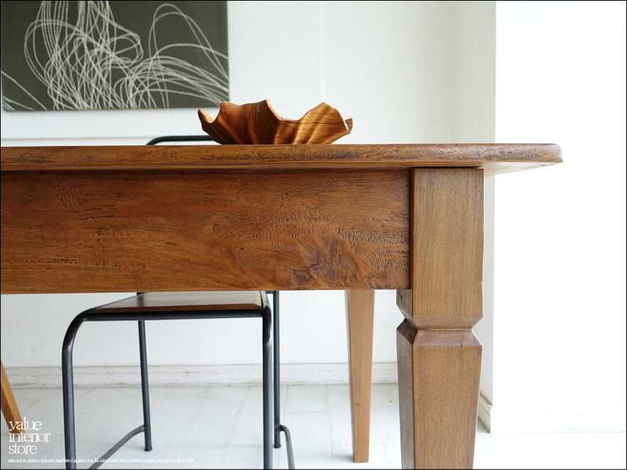 渋く落ち着いた飴色の光沢のある表面に仕上げたオールドチーク総無垢材のダイニングテーブル。一目見ただけで木肌の味わい深さを感じさせてくれます。 天板を支える幕板となるフレーム部分も、しっかりと厚みがあるものを使用していますので重厚感があり大人の雰囲気に仕上がりました。こんなテーブルで毎日食事ができたらペースダウンできステキですね。ショップの展示テーブルやカフェのテーブルとしてもおすすめです。