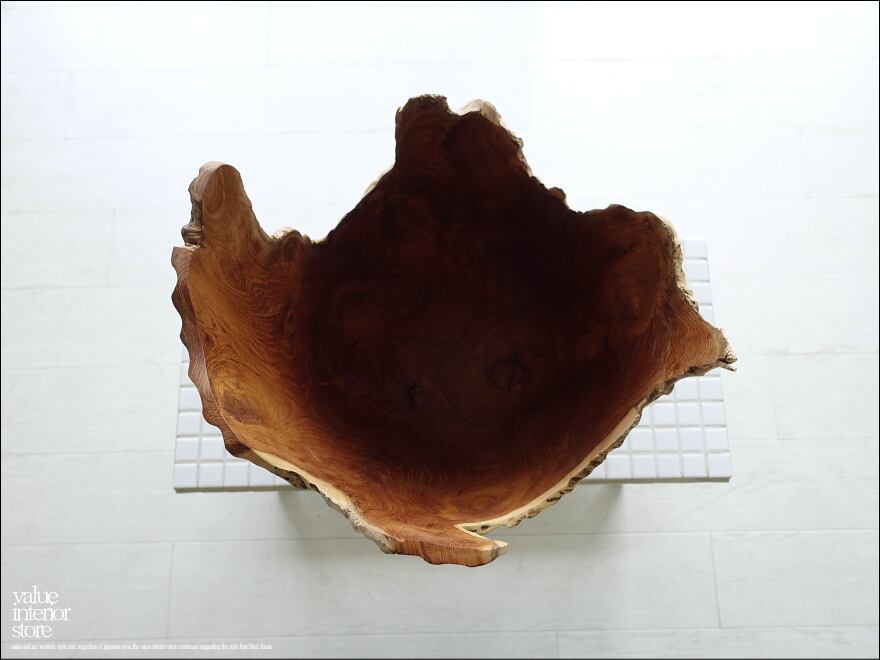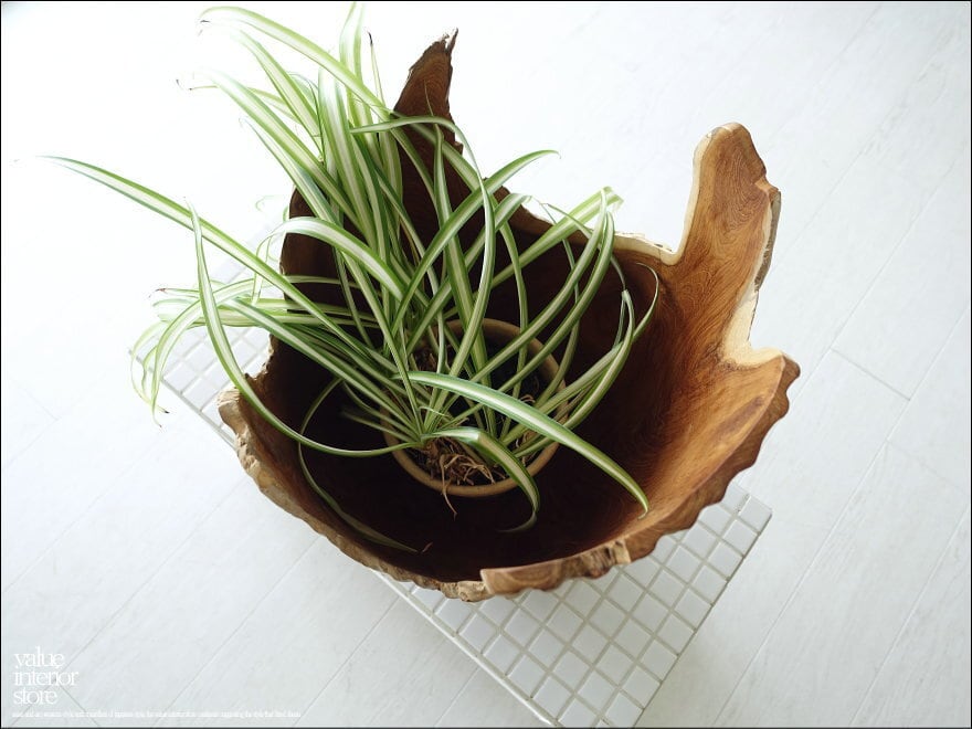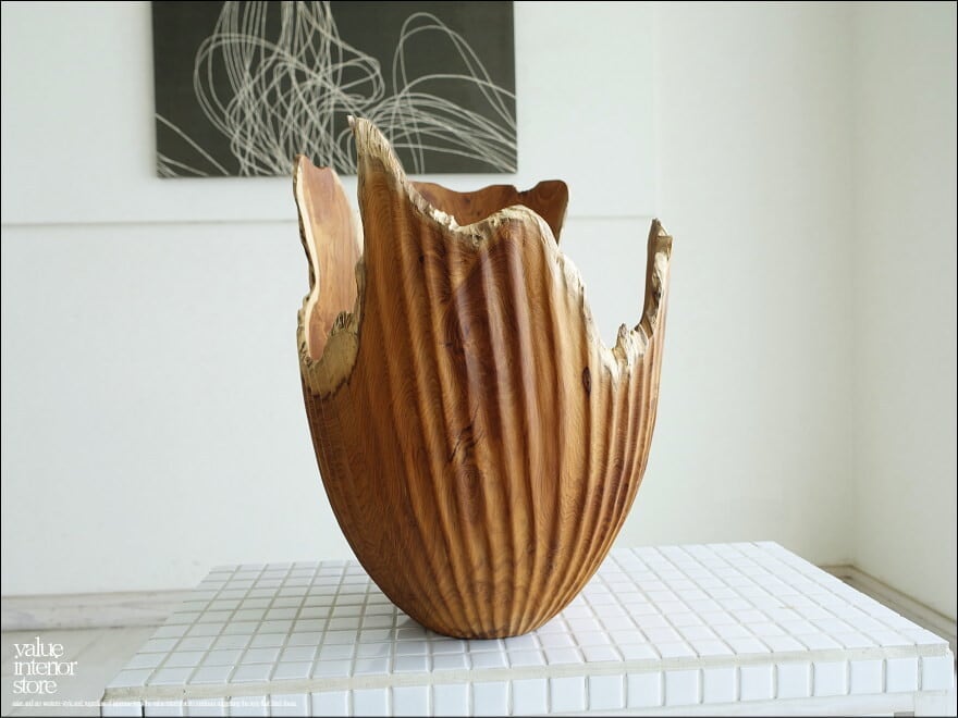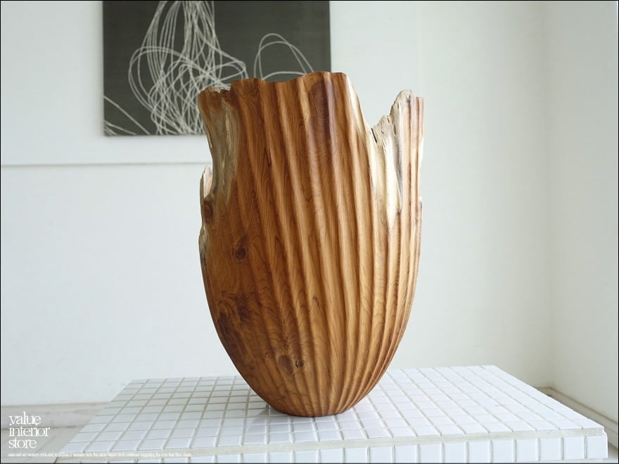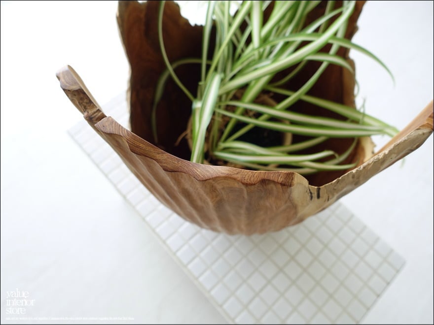 一本の丸太より削り出して製作する、自然な様の形と柔らかで変化に富んだ木肌が印象的なチーク総無垢材のプランツカバー。縦に入ったラインが底に近づくにつれてキュッと引き締まったデザインになっていて目を引きます。ここまで薄く製作ができますのも、張りを持つチーク材で乾燥状態に優れている素材だからこそのものです。