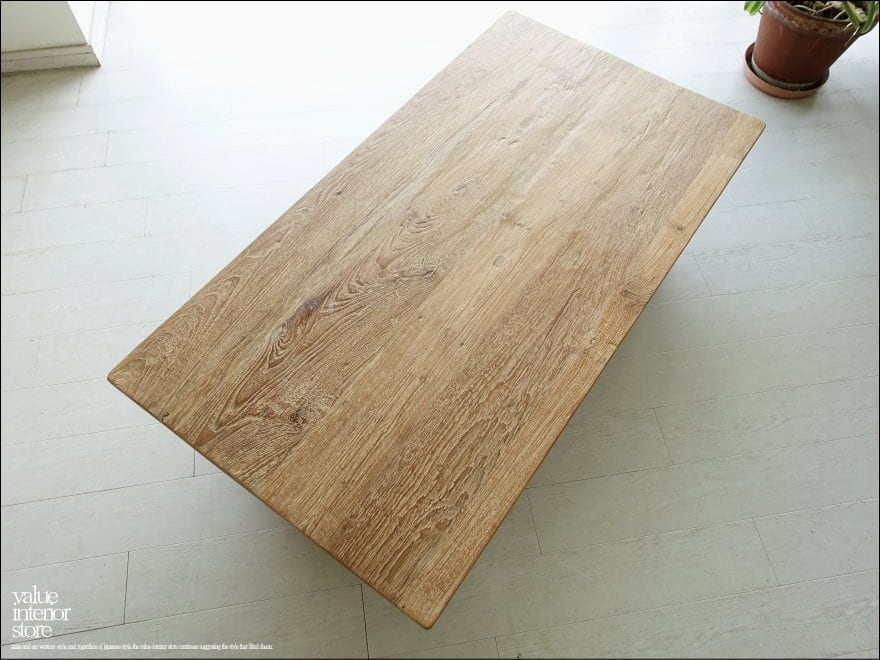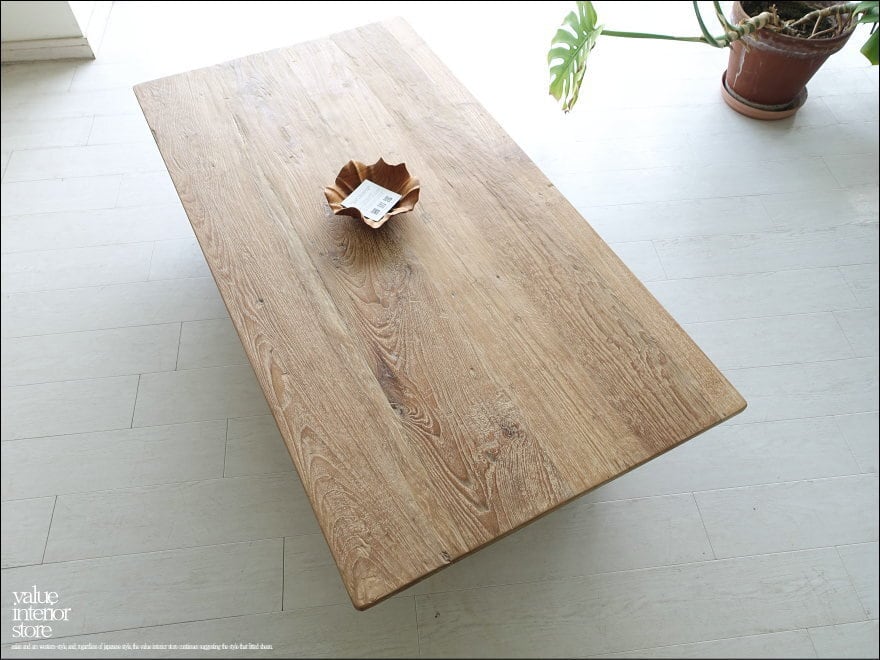 数十年経過したオールドチーク総無垢材で、所々埋め木による修復や古材独特の個性的な造形が見て取れるリビングテーブル。時と共に自然と朽ちた表情は、何とも言えない楽しさと癒しを与えてくれます。おくつろぎをいただくお部屋の中心となるリビングで、落ち着きのある雰囲気をぜひお楽しみください。