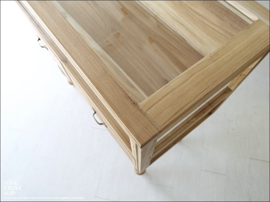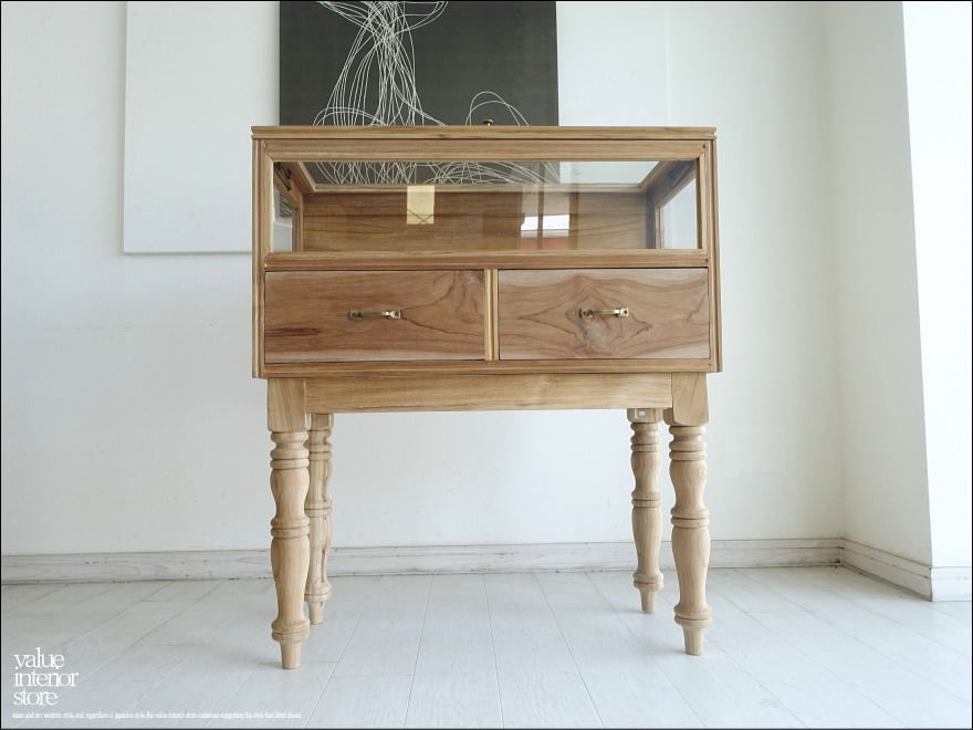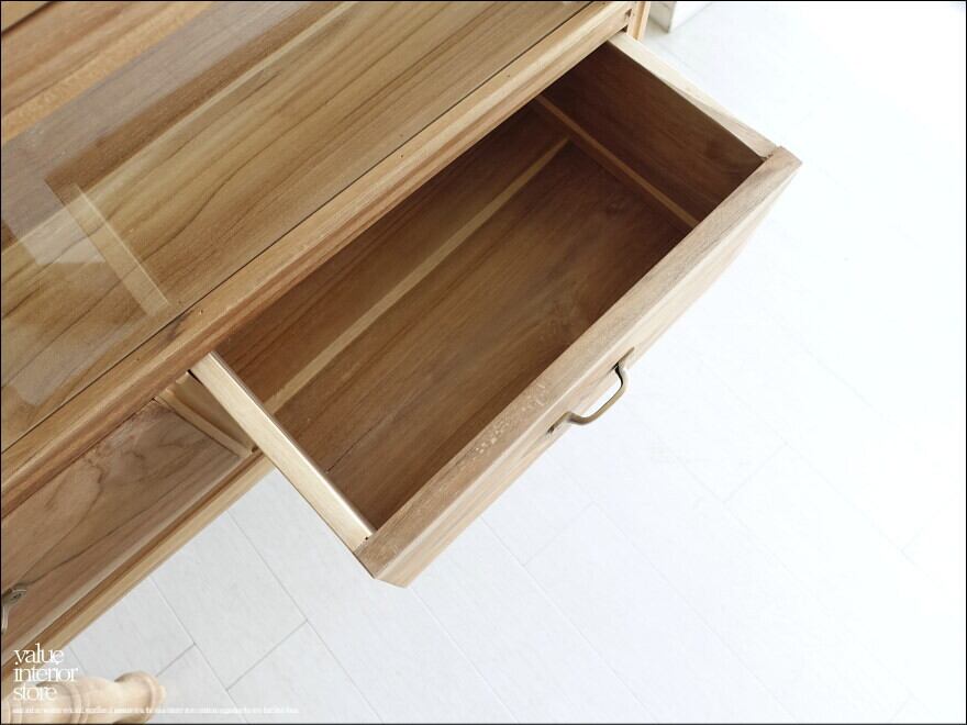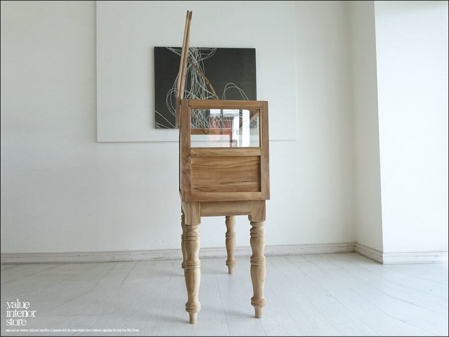 無塗装のチーク材の素朴な質感とクリアガラスの組み合わせが素敵です。ガラス部分には時計やアクセサリーを、チェストには衣類を収納したりと使い分けができます。ショップのショーケースとしてもチェストに在庫を収納できますので便利です。木目の美しいチークは変わり行く色の変化(いわゆるチークカラーへの変化)もお楽しみいただけます。1点1点手作りで、無垢材の良さ感じさせてくれます。お気に入りスペースでお使い下さい。(バリューインテリアストアオリジナル)
