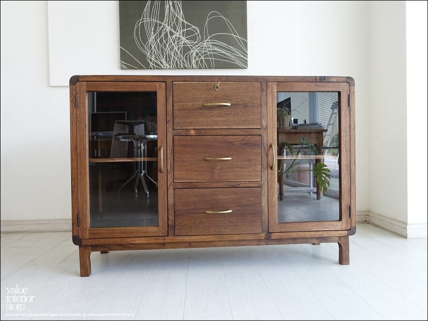 チークの持つ張りと硬く美しい木目の特徴を引き出していて、無垢材の素朴で上質さを十分に感じさせてくれるキャビネット。角が丸みを帯びたデザインですのでとても上品かつ優しい印象の仕上がり。サイドボードや食器棚、本棚など幅広い用途でお使いいただけます。