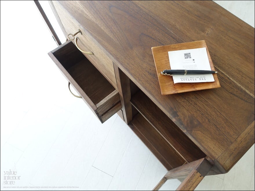 また、チークは油分を多く含みますので、お使いいただくうちにさらに色味に深みが増すところも楽しみの一つです。引出しも3段あるので細かなものの収納にも便利です。一番上の段は鍵つきでレトロな雰囲気なのもいいですね。1点1点手作りで、無垢材の質の良さを感じさせてくれます。お気に入りスペースでお使い下さい。