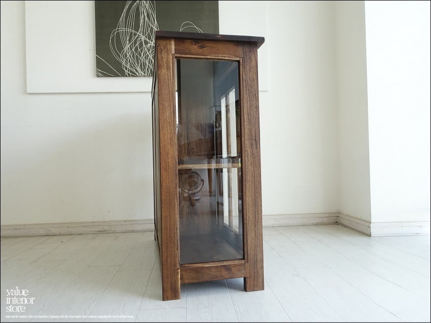 正面・側面がガラス仕様のため光が入りやすく中に収納するものもディスプレイするような感覚で美しく飾りたくなります。真鍮の取っ手もレトロな印象でいいですね。アンティークではありませんが古くからそこにあったような温か味のある仕上がりになっています。
