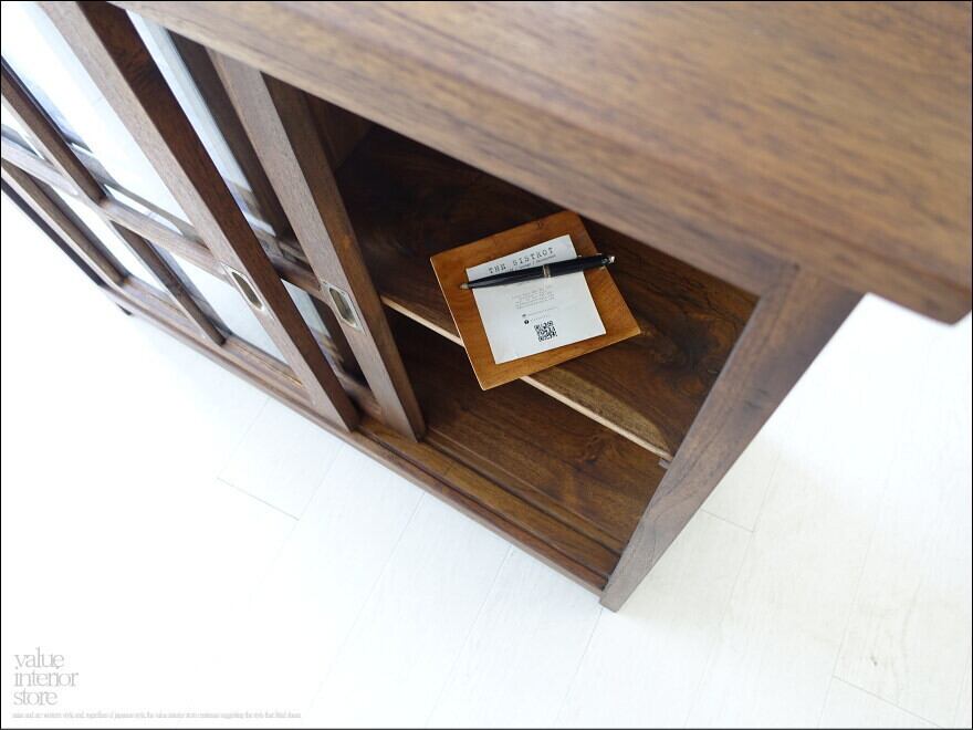 チーク総無垢で仕上げた使い勝手の良いシンプルなスライド扉ガラスキャビネット。