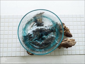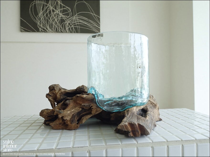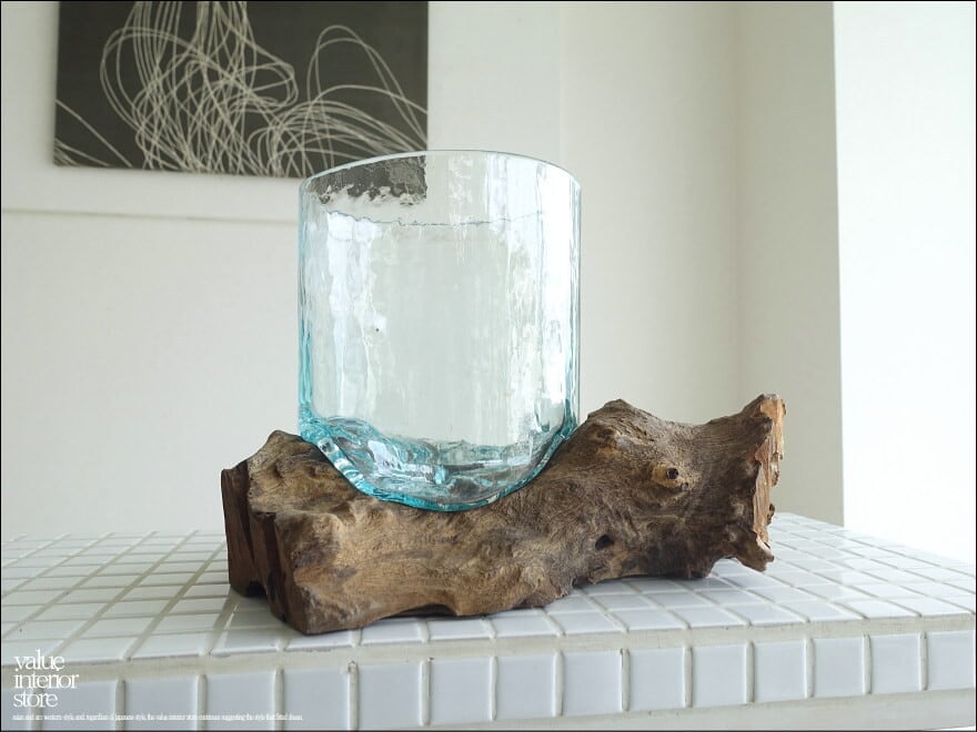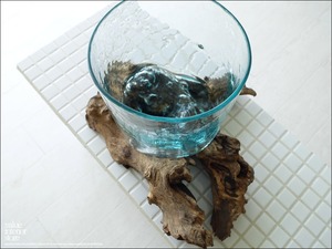 プリミティブな無垢材の土台に吹きガラスを合わせたフラワーベース。メダカ鉢にも良いサイズです。同じ形のものはなく、どちらの素材も大変個性的で味があります。