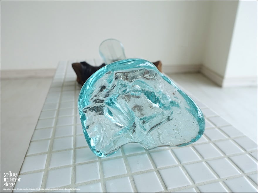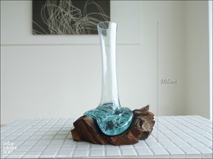 プリミティブな無垢材の土台に吹きガラスを合わせたフラワーベース。一点一点手作りで同じ形のものはなく、どちらの素材も大変個性的で味があります。主役のお花を自然に引き立たせてくれます。
