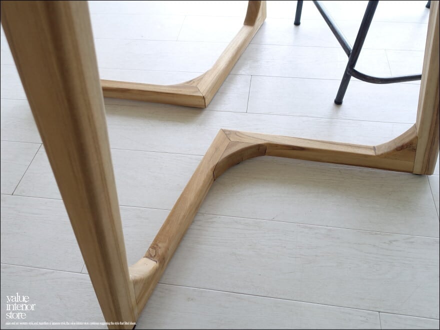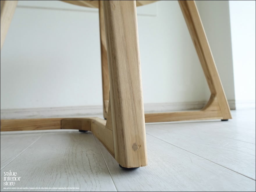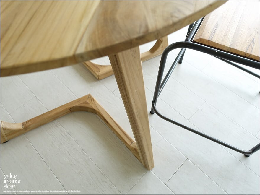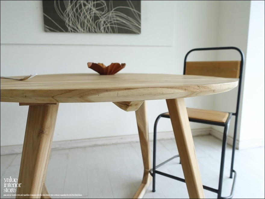 天板をバランスよく安定させるために、内側に入った脚の形状が印象的なチーク無垢材の“丸テーブルbulat“。厚みのある天板下を削ることでよりシャープでシンプルなデザインになっています。表面のコーティングを行わず手を加え過ぎない表面仕上げは、無垢材の上質な質感を感じさせてくれます。
