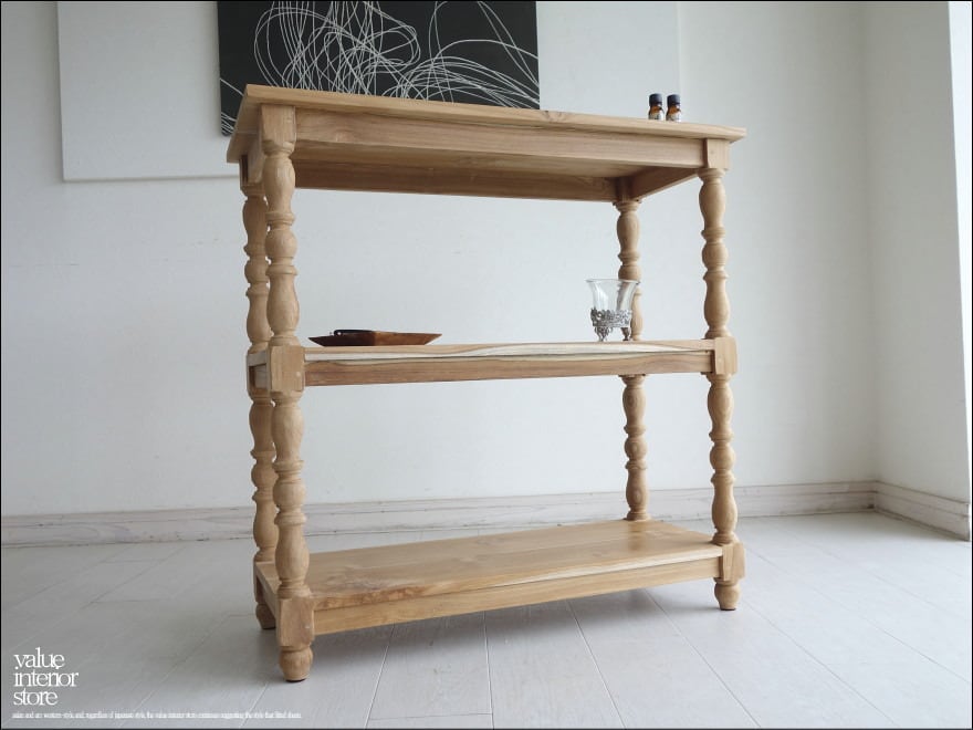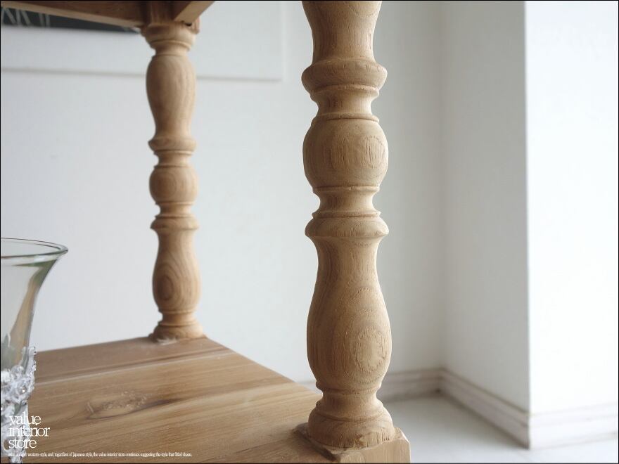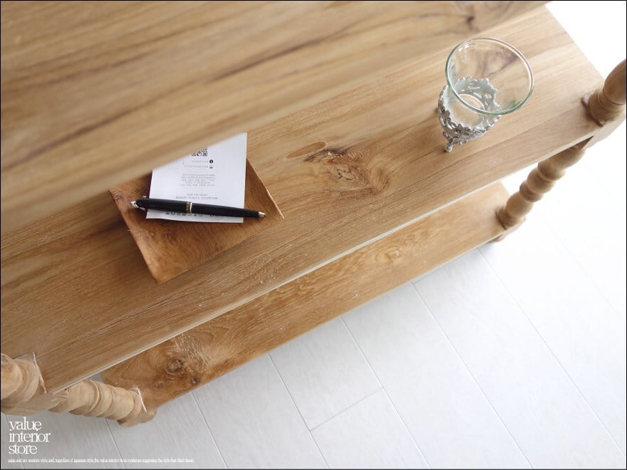 ナチュラルで素朴な質感は、経年変化でいわゆるチーク色へ徐々に変化していくところも楽しみの一つです。余分な装飾を無くしたシンプルな棚板と、丸く柔らかな印象の脚とのバランスがとってもかわいいですよ♪