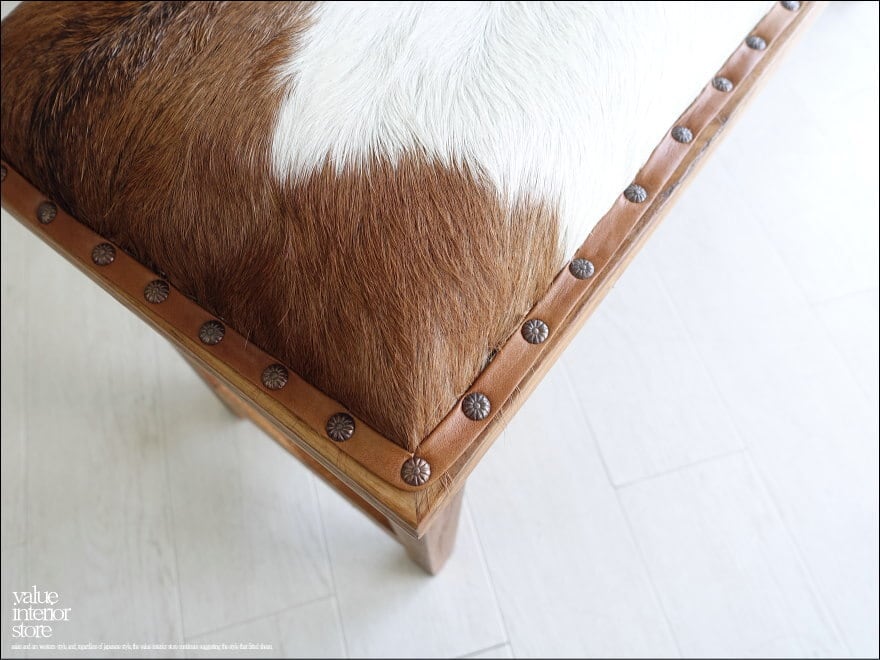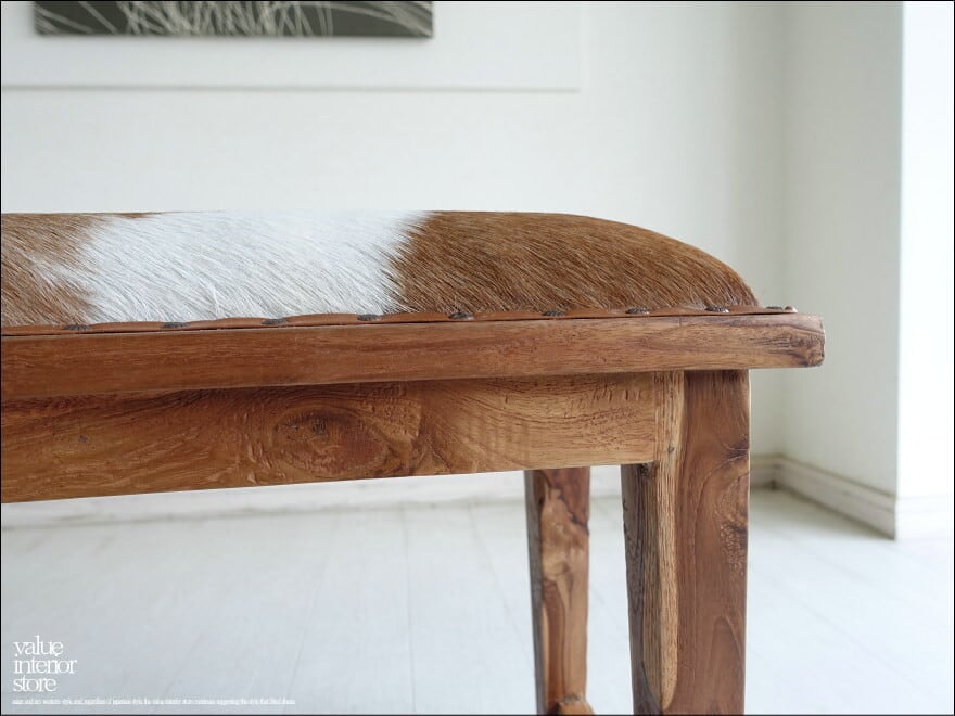 オールドチークの味のある風合いが魅力のウッドフレームに、高級感のある毛皮付きレザーを独特なスタッズで打ち、置いてあるだけでも存在感のあるベンチ。落ち着いた雰囲気でアンティークな家具やアジアン家具とよくマッチします。チークの持つ張りと硬く美しい木目の特徴を引き出していて、素材の良さを感じさせてくれます。お気に入りスペースにぜひお使い下さい。