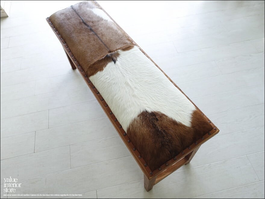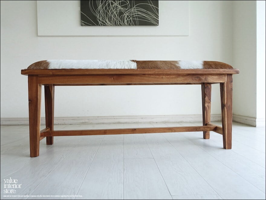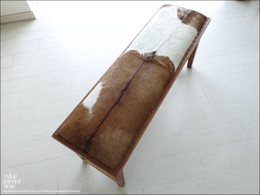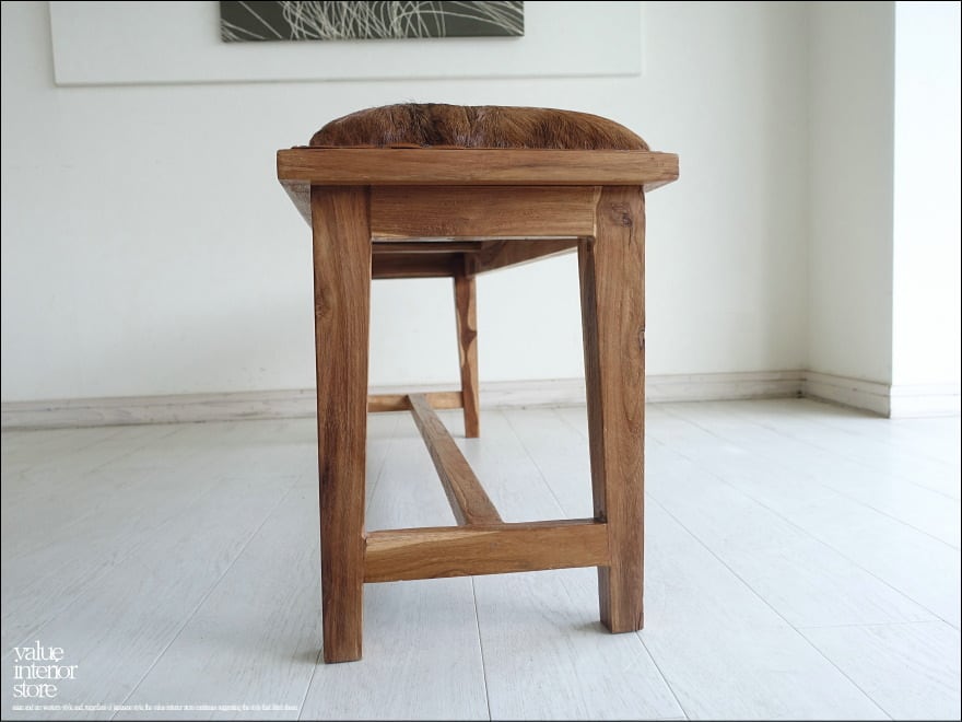 オールドチーク無垢材 毛皮ベンチfur/02 長椅子 本皮ソファ イス 古材 手作り レザー張り 毛皮張り レトロ調 銘木家具 ida