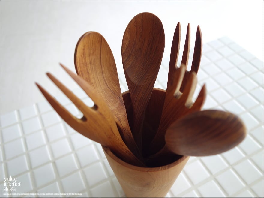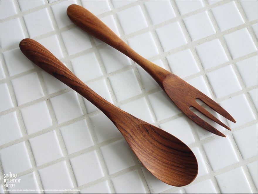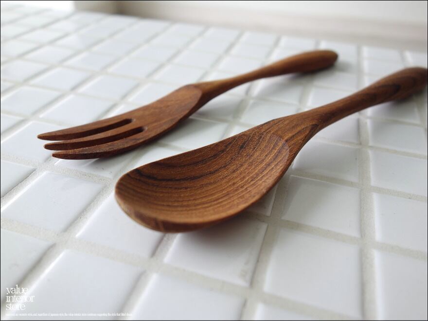 世界の三大銘木の1つに数えられ高級材として知られるチークを使ったディナースプーンとフォークのセット。とても軽くて滑らかな仕上がりは職人の手作り感に溢れています。表面はミネラルオイル(ライム油・大豆油・チョウジ油・ナツメグ油)仕上げ。柔らかな口当たりの良さが魅力的で、手になじみます。