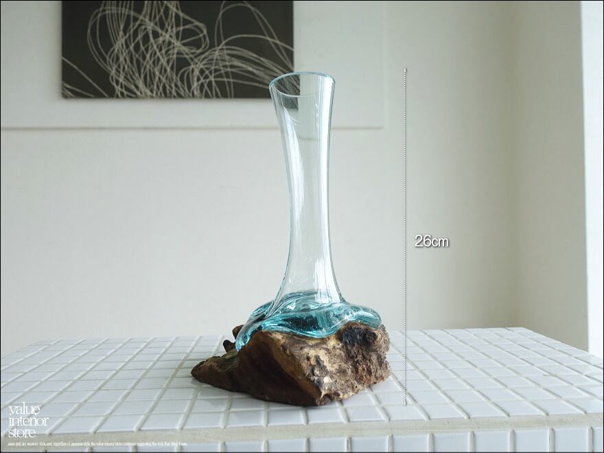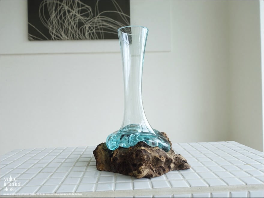 プリミティブな無垢材の土台に吹きガラスを合わせたフラワーベース。一点一点手作りで同じ形のものはなく、どちらの素材も大変個性的で味があります。主役のお花を自然に引き立たせてくれます。