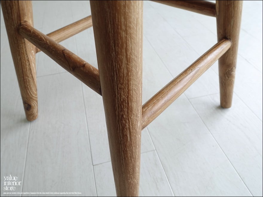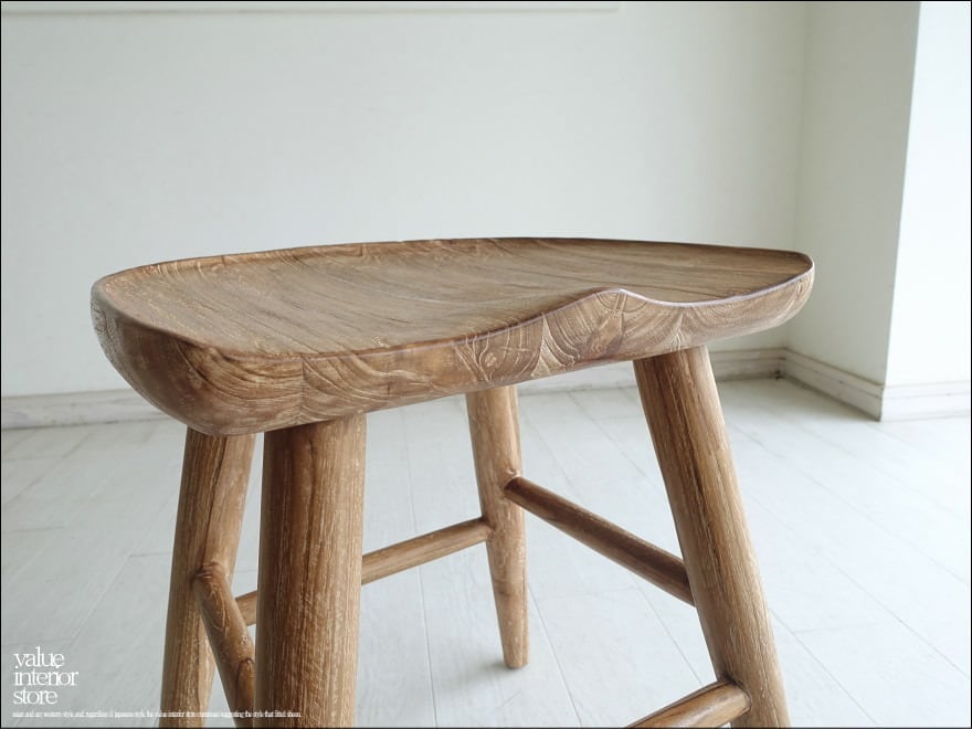 座面をおしりの形に仕上げることで、体重を少し分散して楽にお座りいただけるチーク無垢材のスツール“Bol/NR”。表面をワイヤーブラシで凹凸を付ける仕上げにより、無垢材の素朴さが一層際立っています。細身の脚は左右各2本、前後各1本のフレームで組んでいますので、シッカリと十分な強度があります。