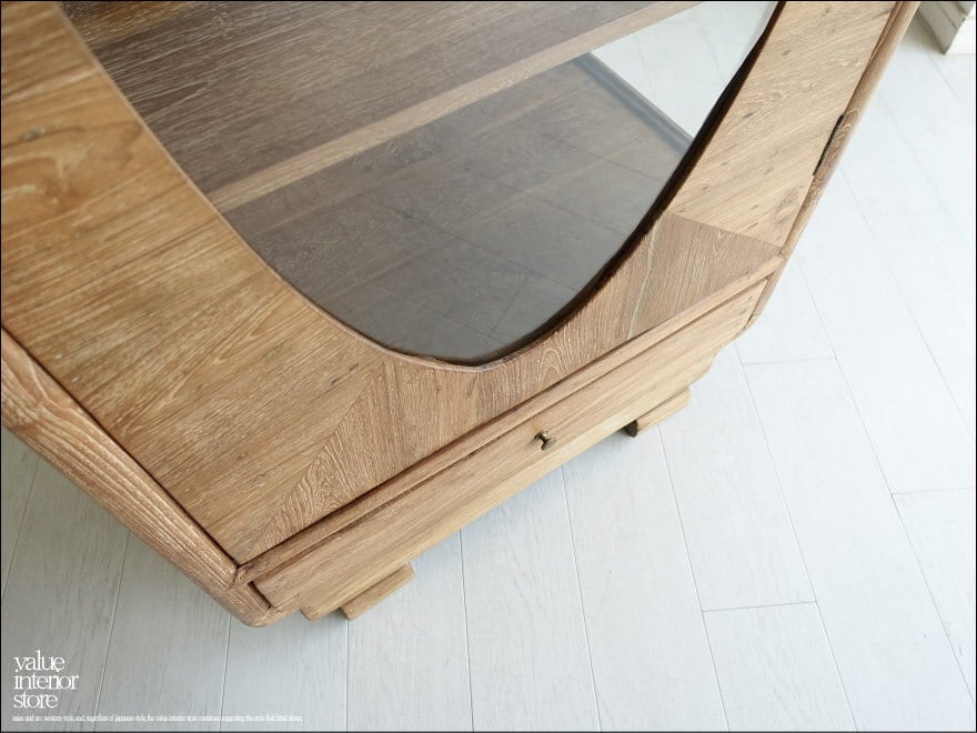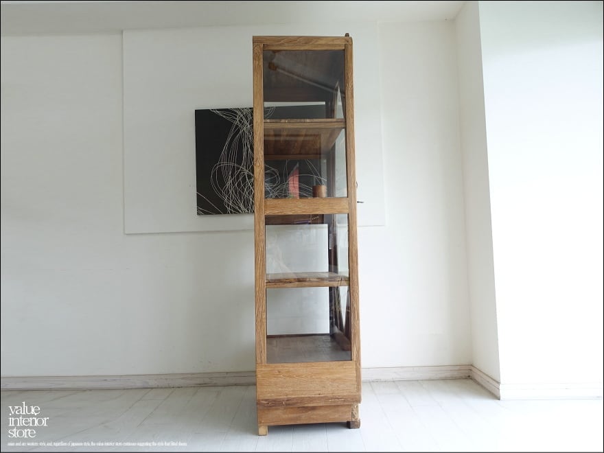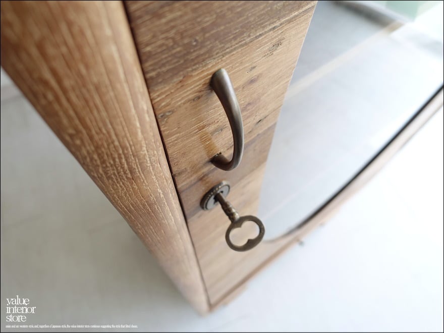 存在感のある大きさで奥行きもたっぷりあるのでキッチンの食器棚としてもリビングの収納棚としても便利にお使いいただけます。扉はガラスなのでディスプレイするような感覚で中に入れるものにもこだわりたくなります。扉は真鍮鍵付き。鍵がとても可愛らしく、きちんと機能しています。全体的に素朴で落ち着いた色合いでシックな雰囲気を残した表面処理(ワイヤーブラシで表面を削るラスティック仕上げ)になっています。カフェやショップなどの什器として食器棚、本棚、収納棚などにもおすすめです。