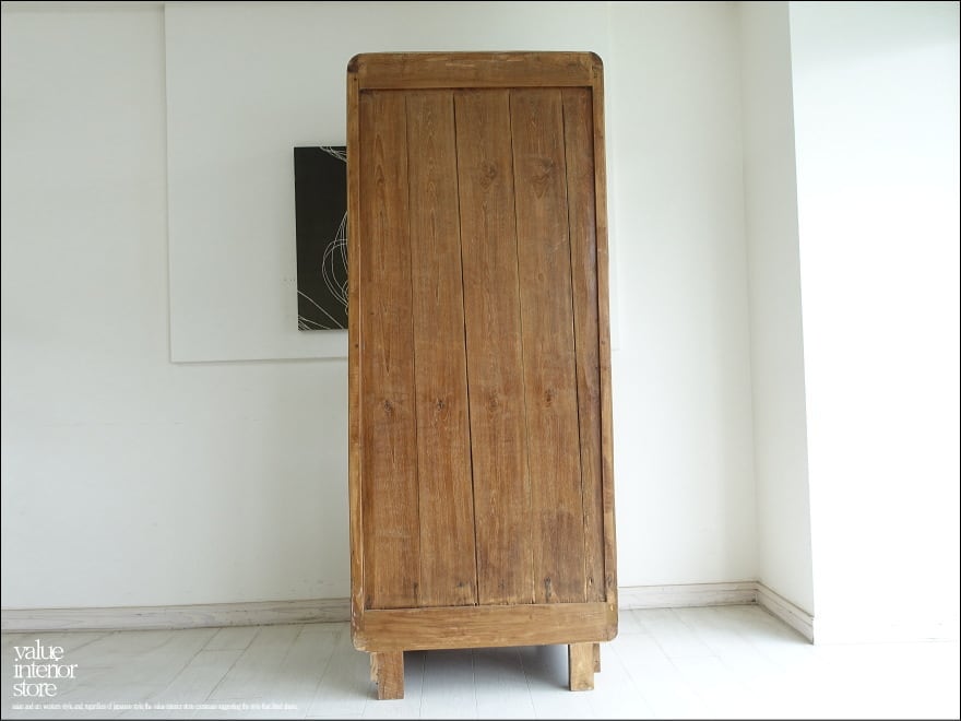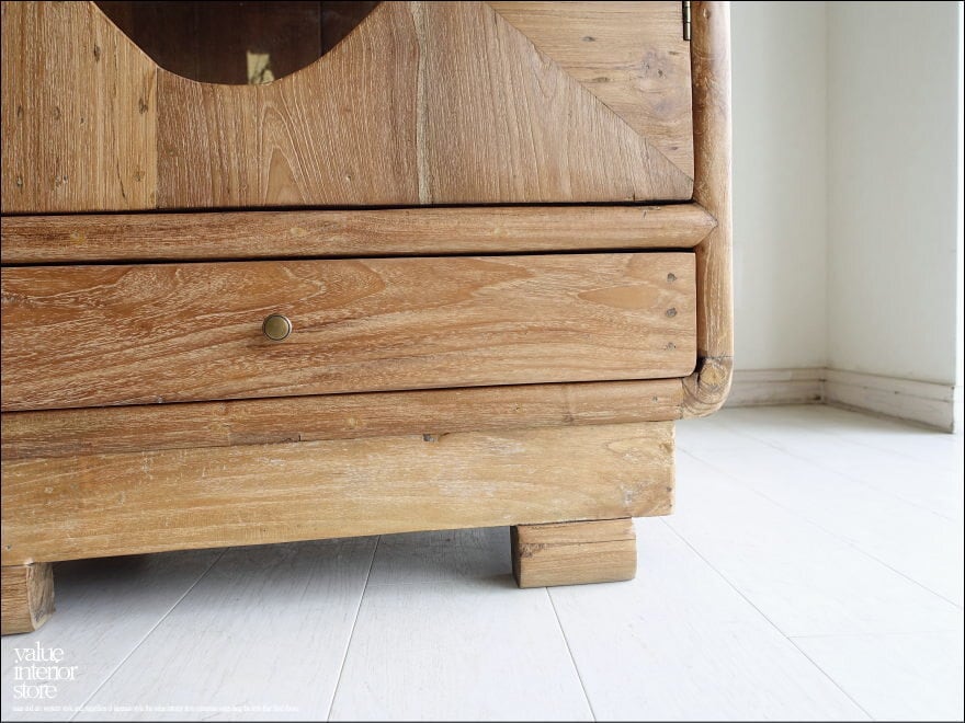 古い歴史を感じさせる佇まいが魅力のチーク総無垢のアンティークキャビネット。