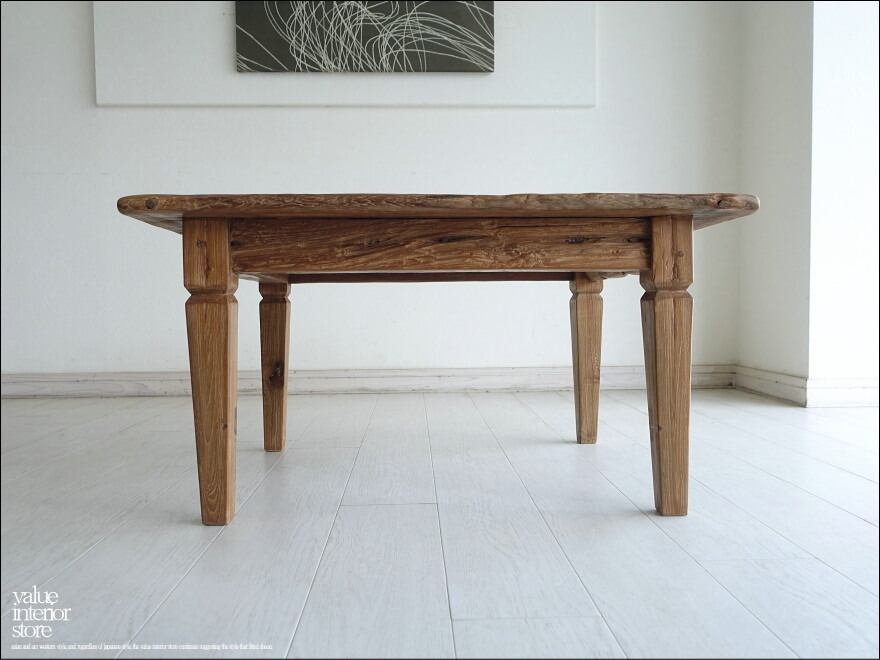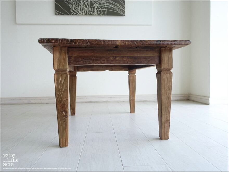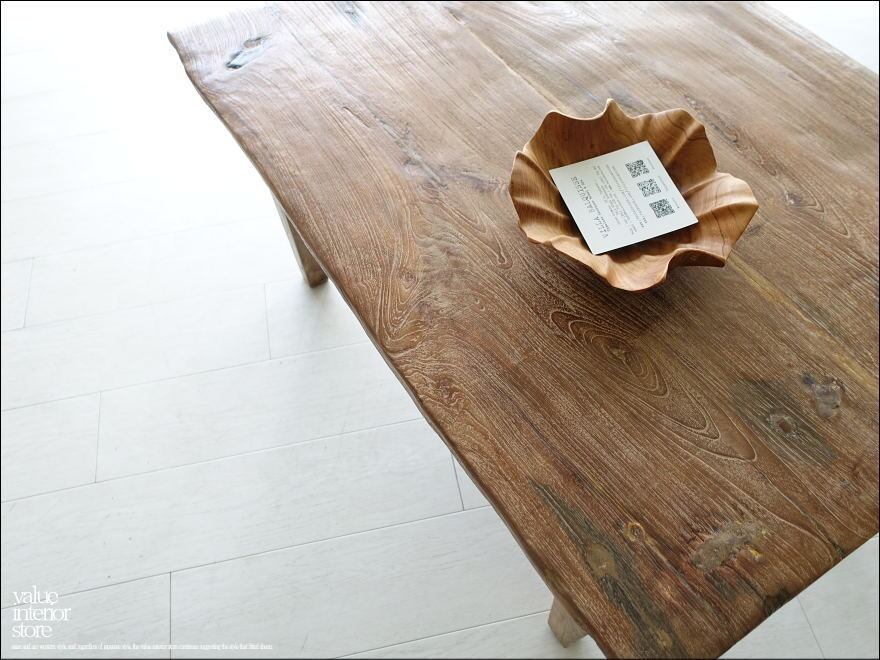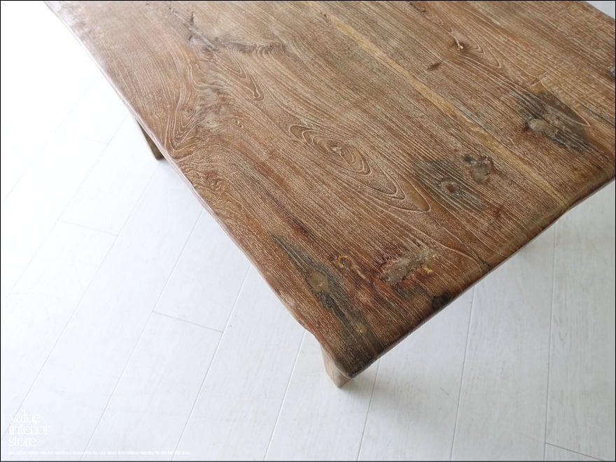 古材の暖かみとプリミティブな天板が目を惹くオールドチークリビングテーブル“Einz”。 程よく厚みのある素材に、天板を支える幕板と脚はオールドチークで製作しています。ラスティック仕上げの粗さのある木肌も、チーク材の張りと硬さを見た目にも感じさせてくれて堂々としています。また、陥没個所の補修のための埋め木もアクセントとして味わいのあるテーブルに仕上がっています。