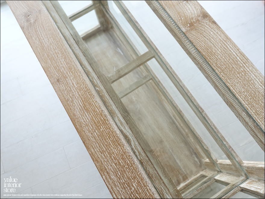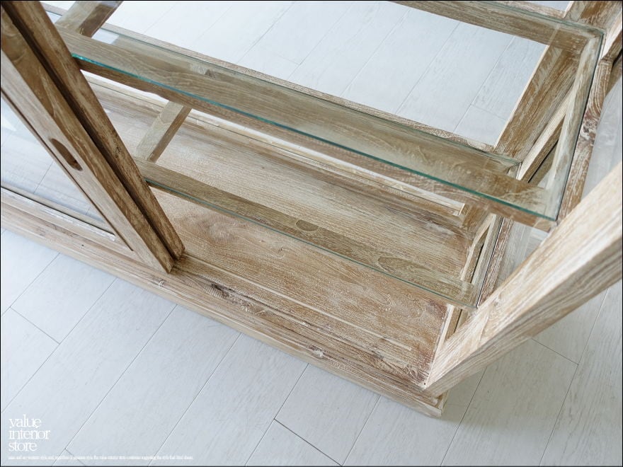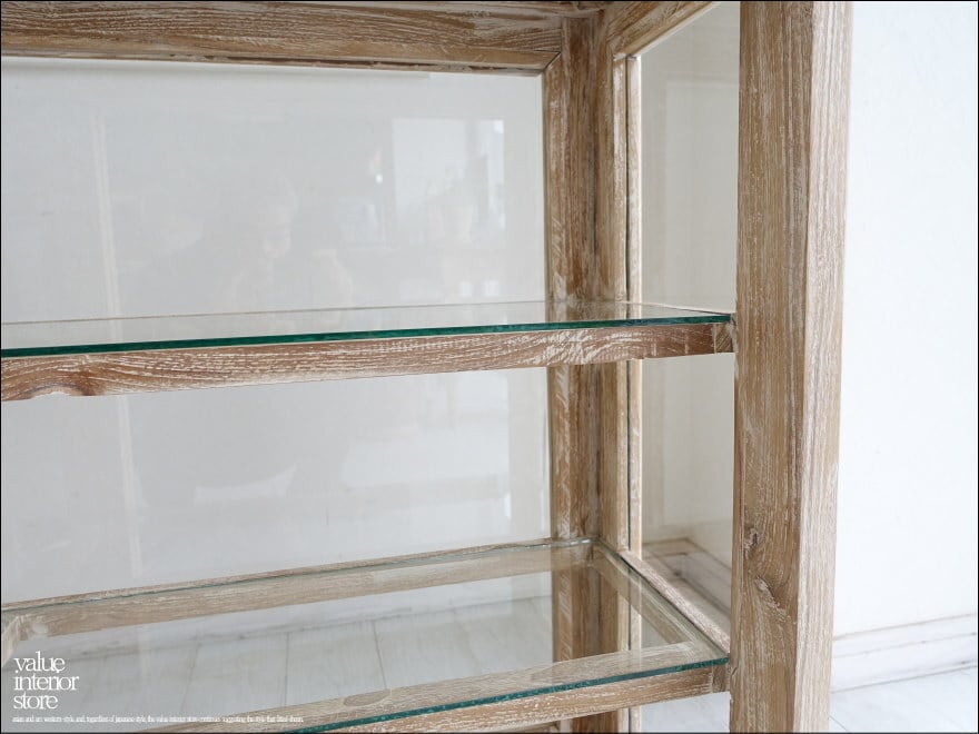 棚板をガラスで製作していますので、下段まで光を取り入れやすく収納いただく食器やお店の商品など一層引き立たせてくれます。素材から感じられる無垢材独特の柔らかな風合いは、毎日お使いになるキッチンに楽しさや明るさを与えてくれます。お店などのショーケースとしてもぜひお使いください