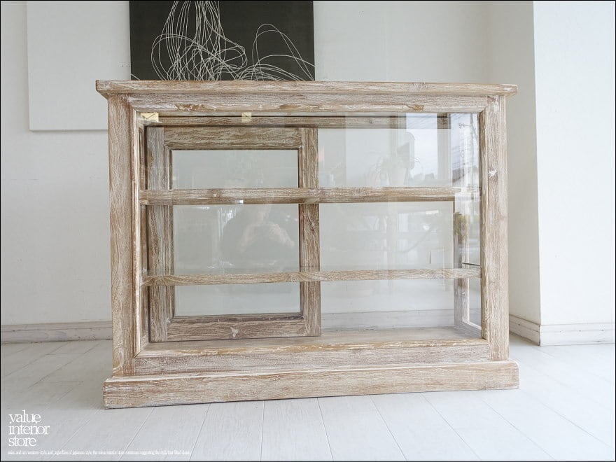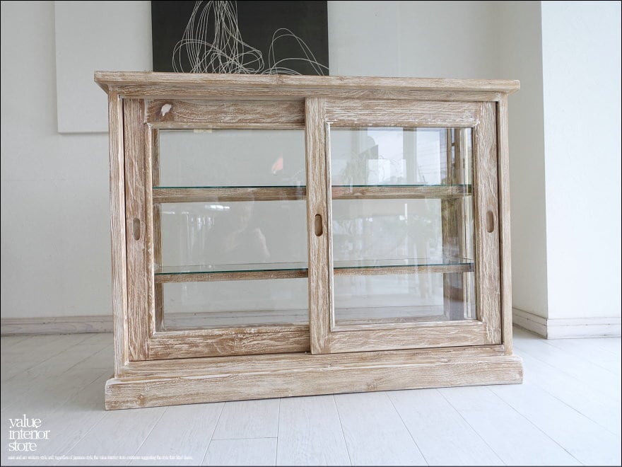 硬く張りのあるチーク材の表面の木目を起こし、凹みに白色を少し残す表面仕上が新鮮な印象の引戸のガラスショーケース。