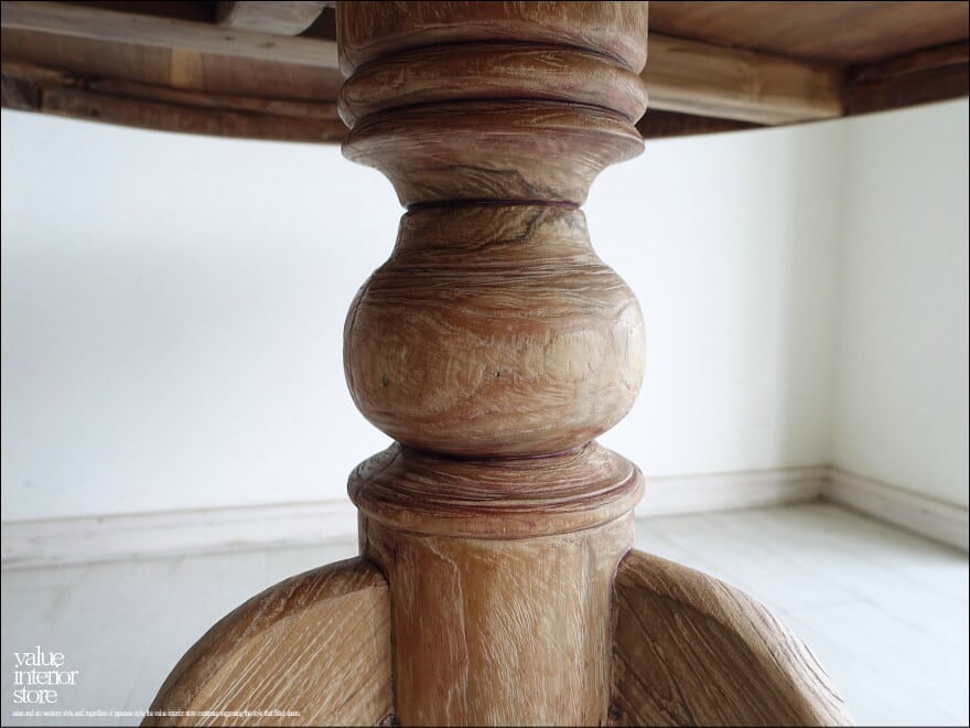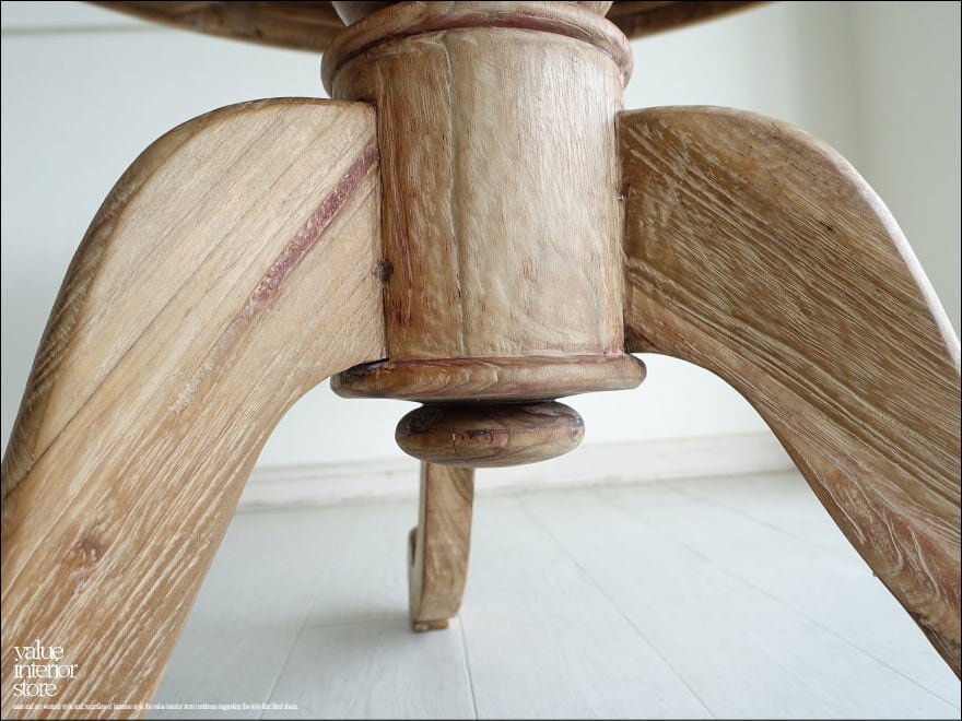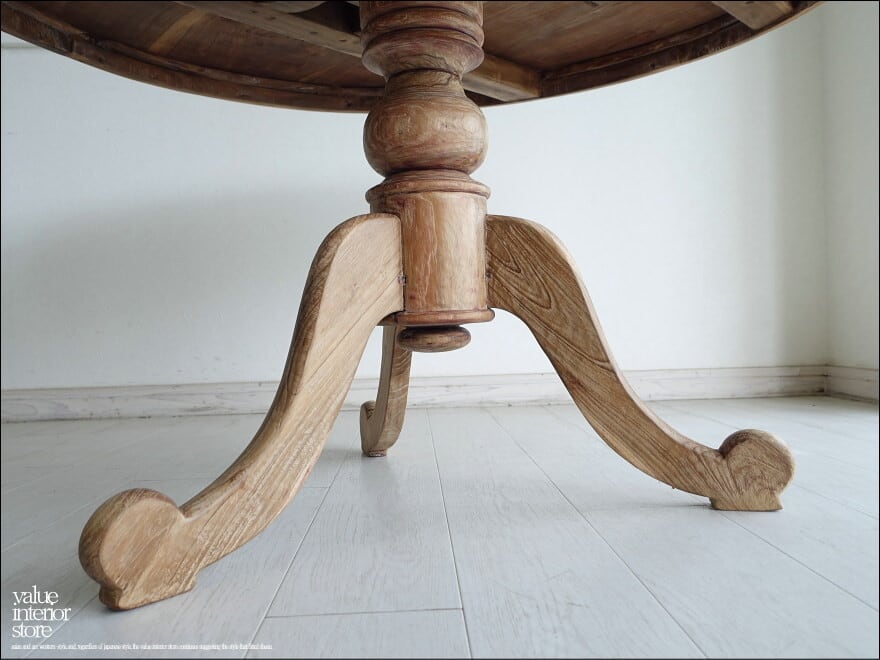 堂々としたデザインとチーク材特有の色合いで、古いものならではの渋く落ち着いた雰囲気が全体から感じられます。天板の側面にも飾りの加工を施し、脚となっている支柱部分は継の無い太い素材から削り出して製作されていて、そこから伸びる緩やかにカーブした脚が全体を柔らかな印象に包み込みます。