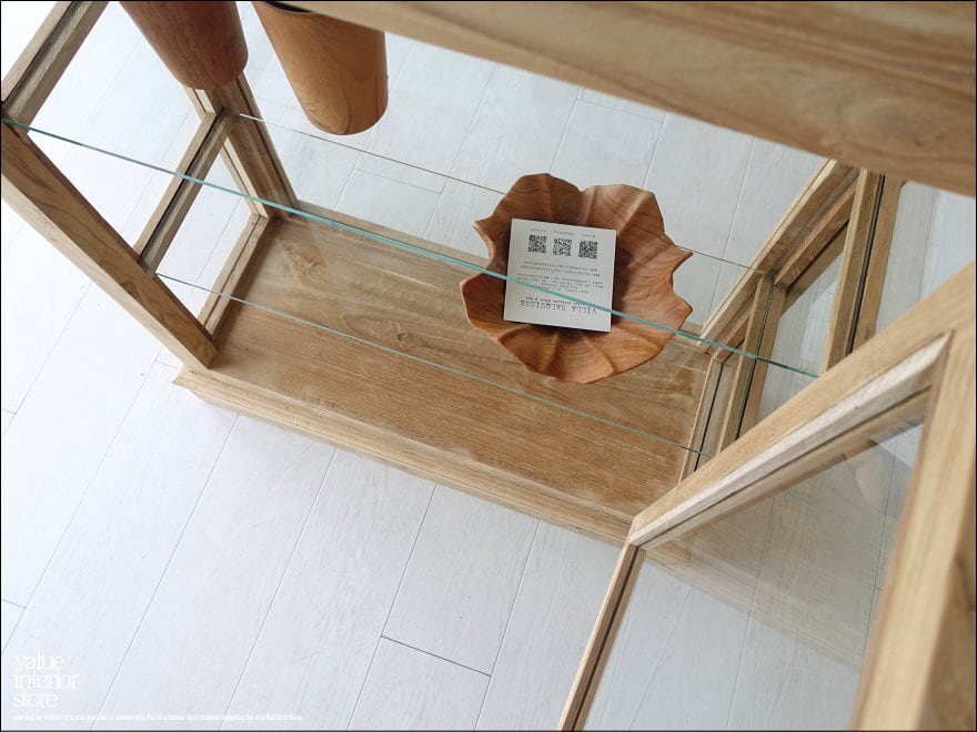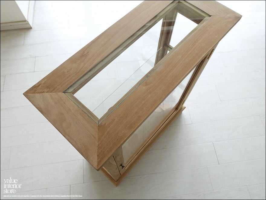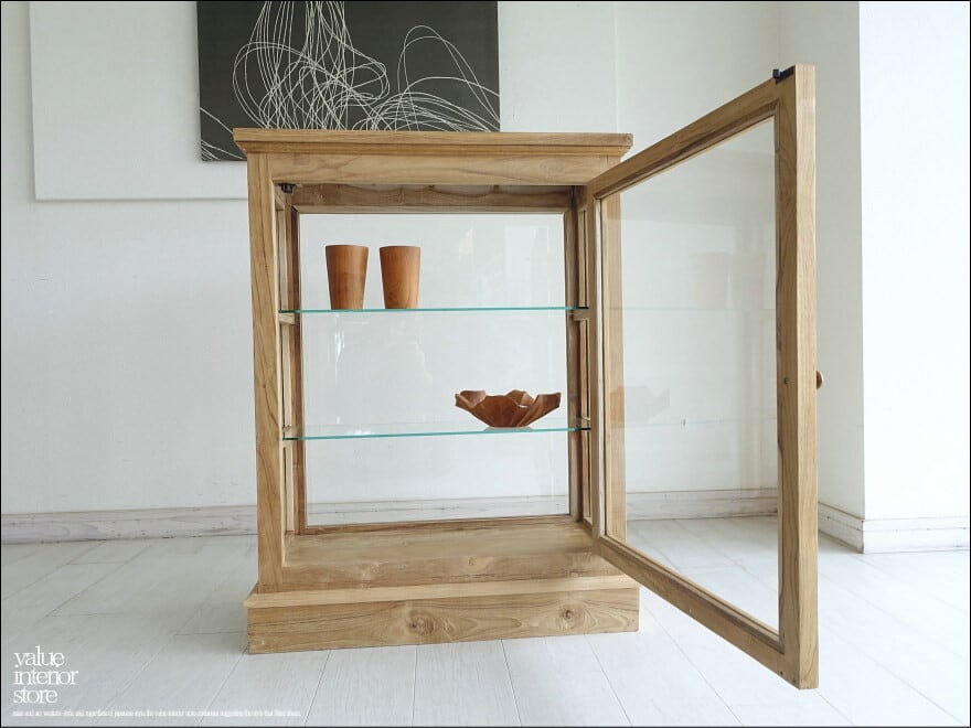 ナチュラルなチーク無垢材の素材感に溢れるガラスショーケース”Vitri/N” 天板を含めて五面ガラスでどの角度からも中に光を取り入れやすく、飾っていただくものを引き立たせてくれます。お店のショーケースとしてもぜひお使いください。表面は無塗装(発送前に薄くオイルを伸ばします)ですので、変わり行く色の変化(いわゆるチークカラーへの変化)をお楽しみいただけます。1点1点手作りで、無垢材の素朴な質感を十分に感じさせてくれます。