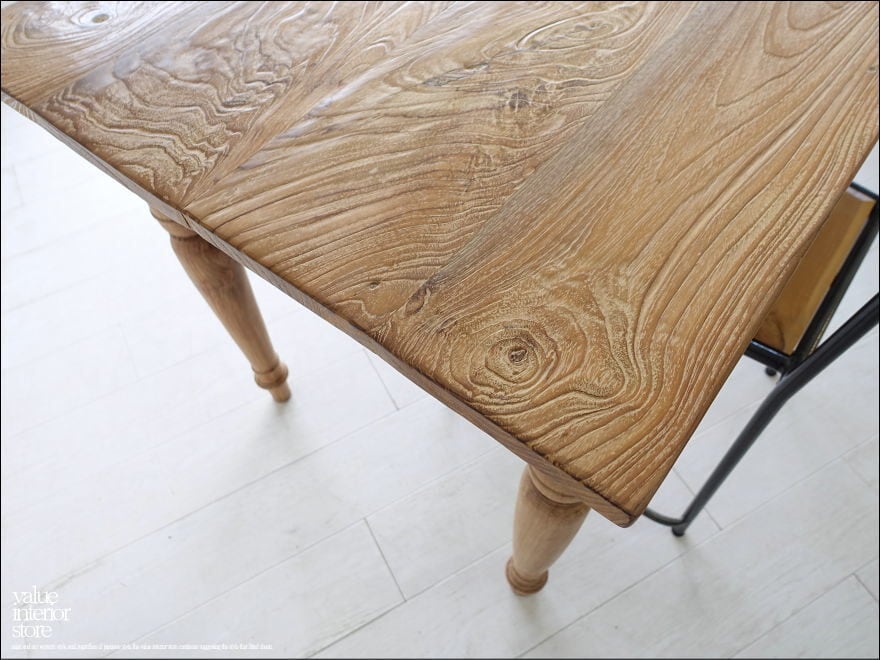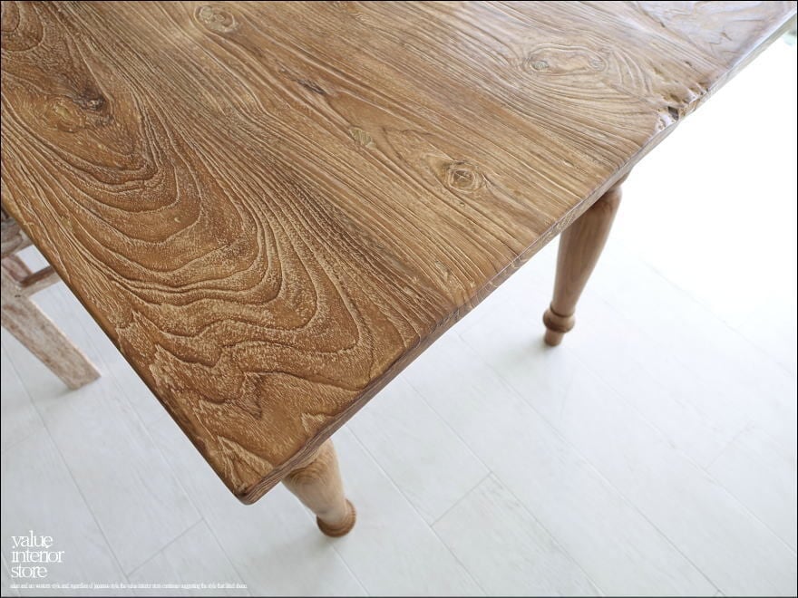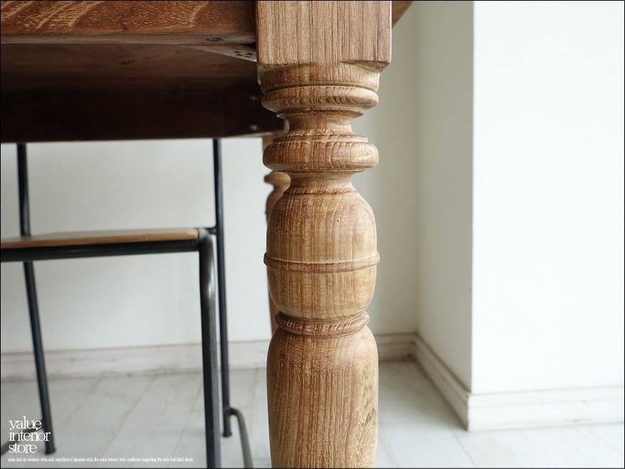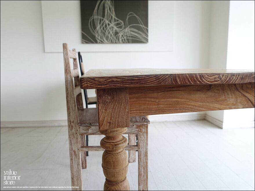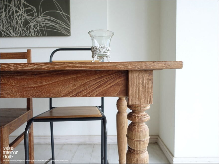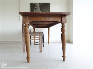 細身でバランスの取れた遊び心に溢れる脚のデザインが特徴的で、古いチーク材ならでは余裕を感じさせる落ち着きには刻み込まれた歴史すら感じられるようです。飲食店のアクセントテーブルとして、お店の展示テーブルなどスローダウンした雰囲気づくりにもぜひお役立てください。