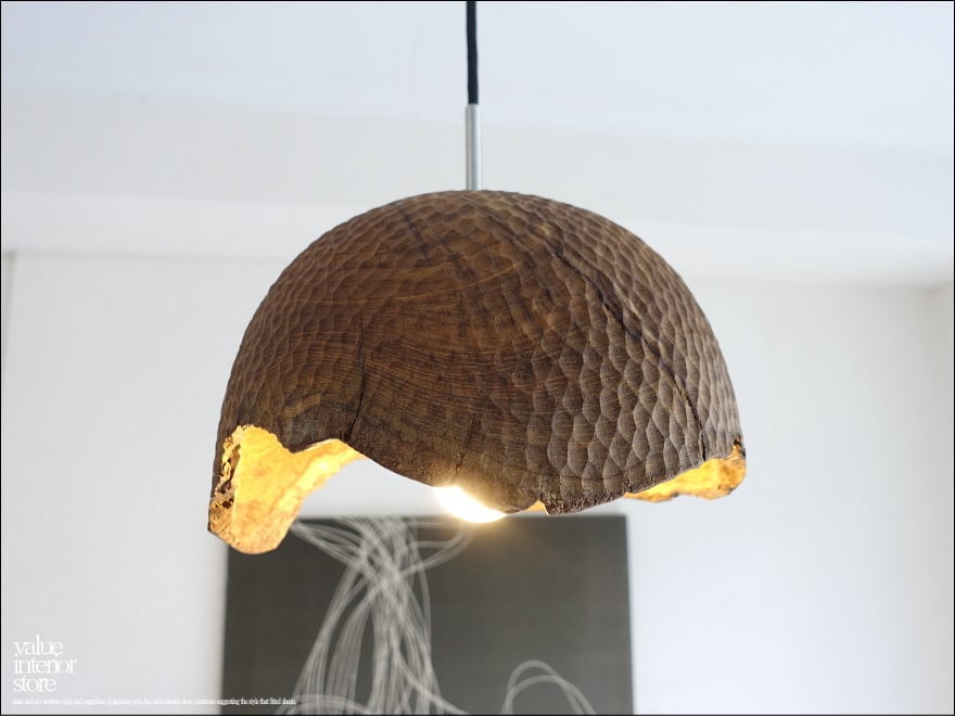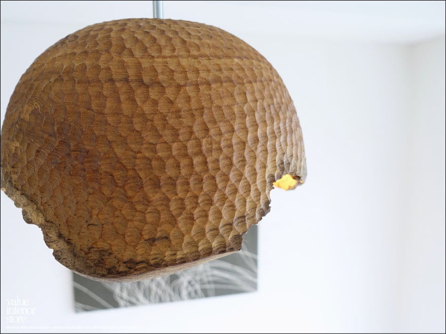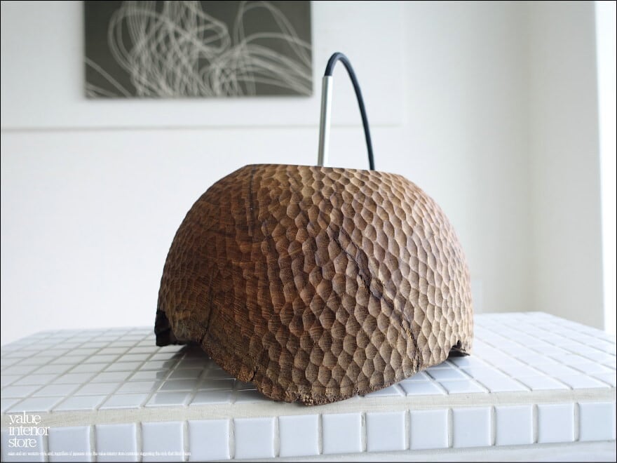 プリミティブな無垢材シェードの表面に手彫りで凹凸をつけた飾りが、何とも雰囲気があり、温かみを感じさせてくれます。空間のアクセントづくりにどうぞお役立てください。天井電源コネクターは、一般家庭用の引っ掛けシーリングタイプ(安全ストッパー付き)。・コードは長さ調節不可。電源は壁スイッチ操作。