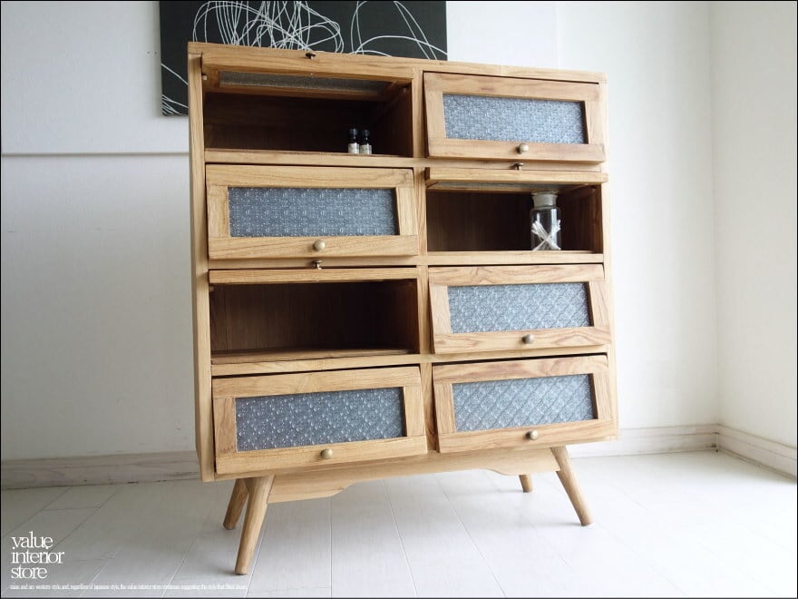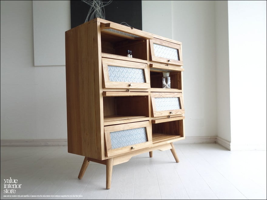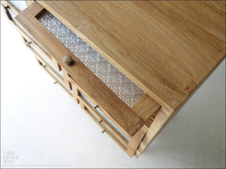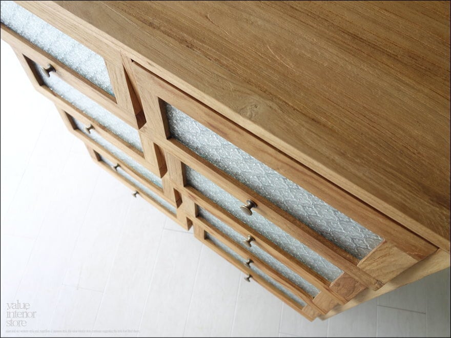 ガラス扉は引き上げるようにして開きます。ツマミは真鍮製。引き上げた扉はそのまま奥へ押し込み収納できるのでオープンの状態にも出来ます。スマートな印象ながら、ワイヤーブラシで仕上げることで、チークの持つ硬く美しい木目の特徴を引き出しています。表面もワックスフィニッシュのみですので、変わり行く色の変化(いわゆるチークカラーへの変化)をお楽しみいただけます。1点1点手作りで、無垢材の質の良さを十分に感じさせてくれます。お気に入りスペースでお使い下さい。飾りガラスの扉なので中身が見えないので気にせず収納できるのも嬉しいですね。
