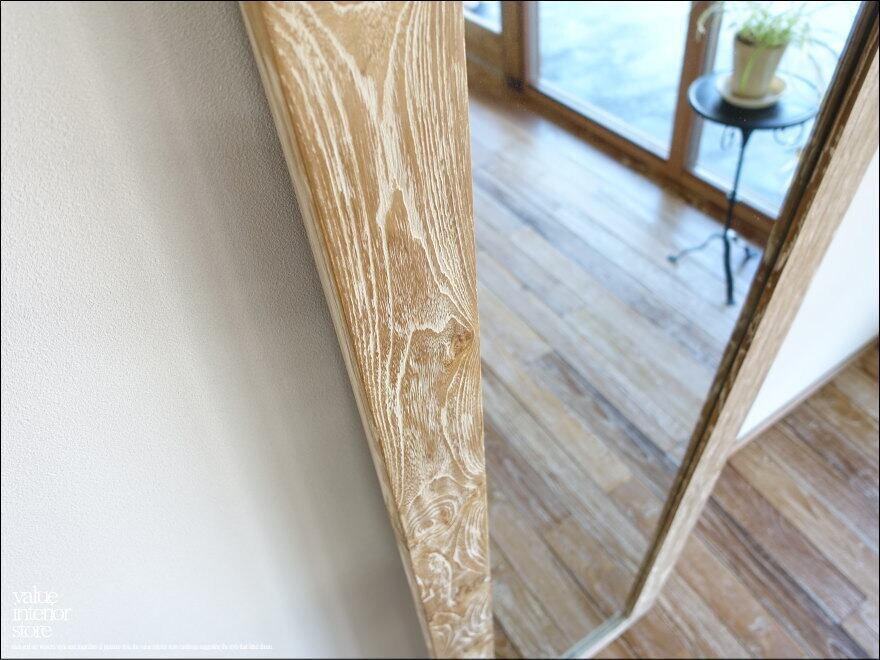 チークの表面をワイヤーブラシで軽く削り、木目を起こした後で薄っすらと白色を塗布してからペーパーで表面を磨くナチュラルホワイト仕上げのミラー。全身を映せるサイズの姿見です。シンプルでどんなテイストにも馴染みやすいデザインですので、空間を暖か味のある雰囲気に演出します。フレーム裏面縦方向に2箇所壁掛け用の穴がありますので壁にビスを設置して頂き引っ掛けるか、安全な場所に立掛けてご使用下さい。