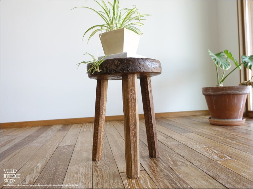 オールドチーク無垢材 プリミティブ丸スツール/01 椅子 花台 古材スツール ナチュラル カフェチェア 無垢材家具