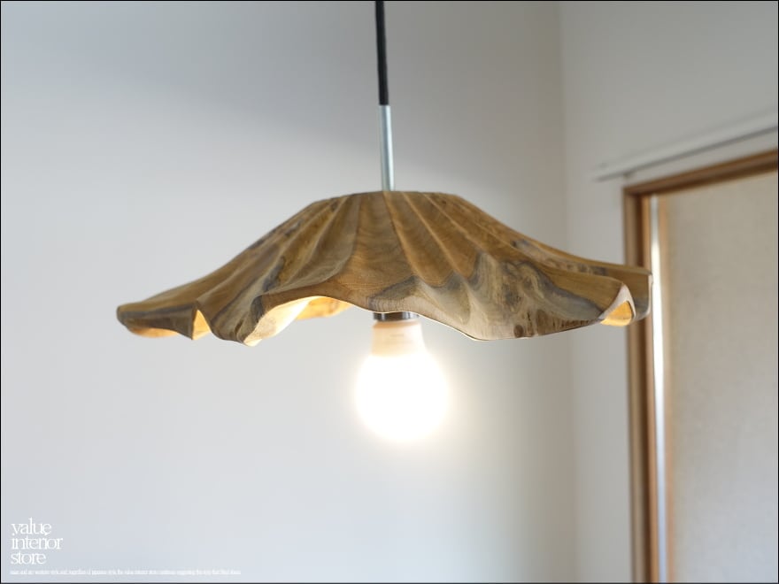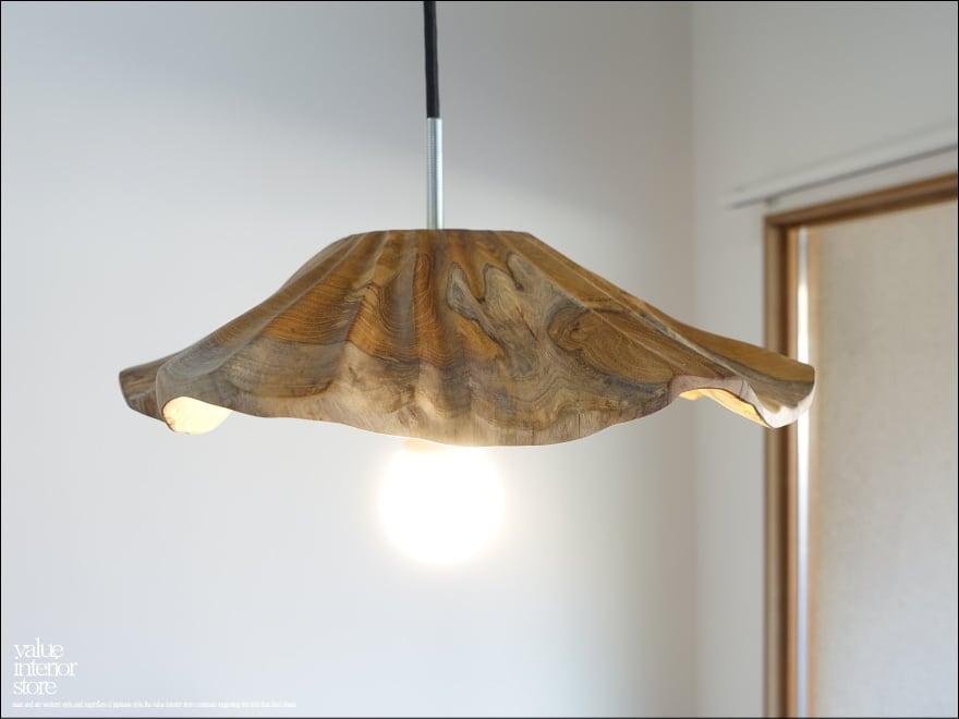チーク無垢材 ペンダントライトFlareW/Msize 天井照明 照明器具 ランプシェード 明かり 吊り下げ灯 手作り 削り出し 世界三大銘木