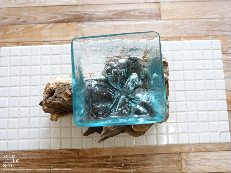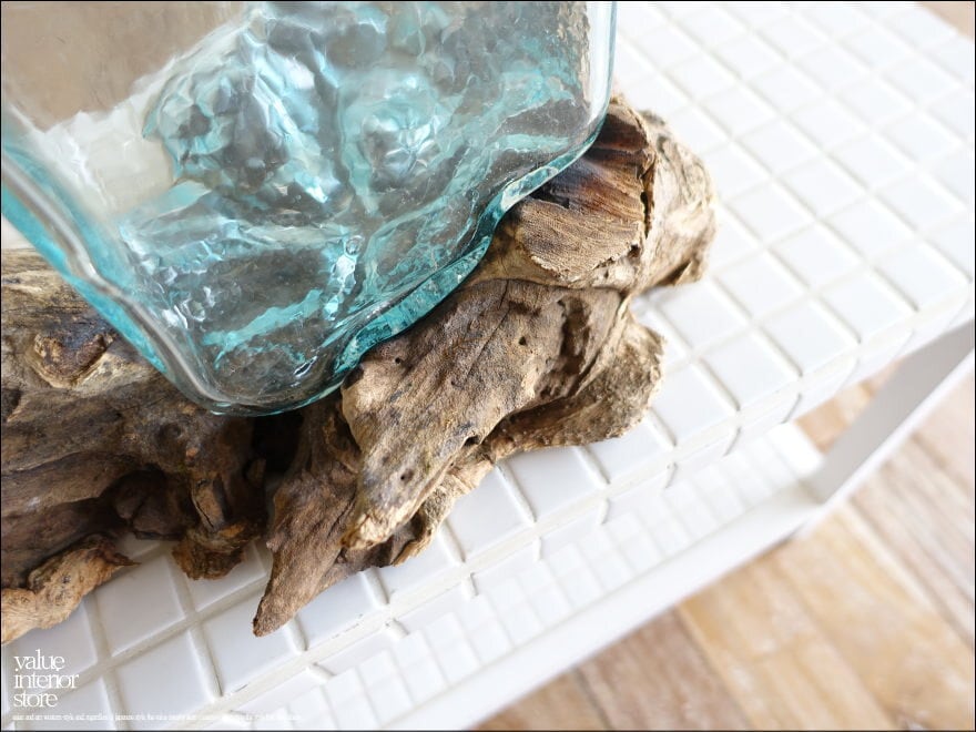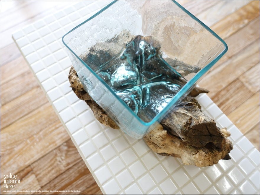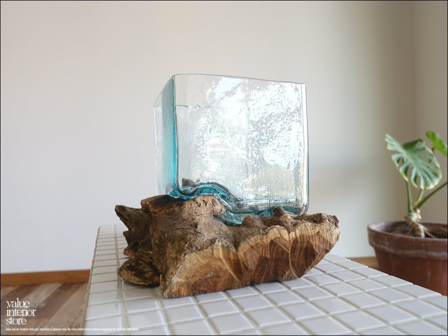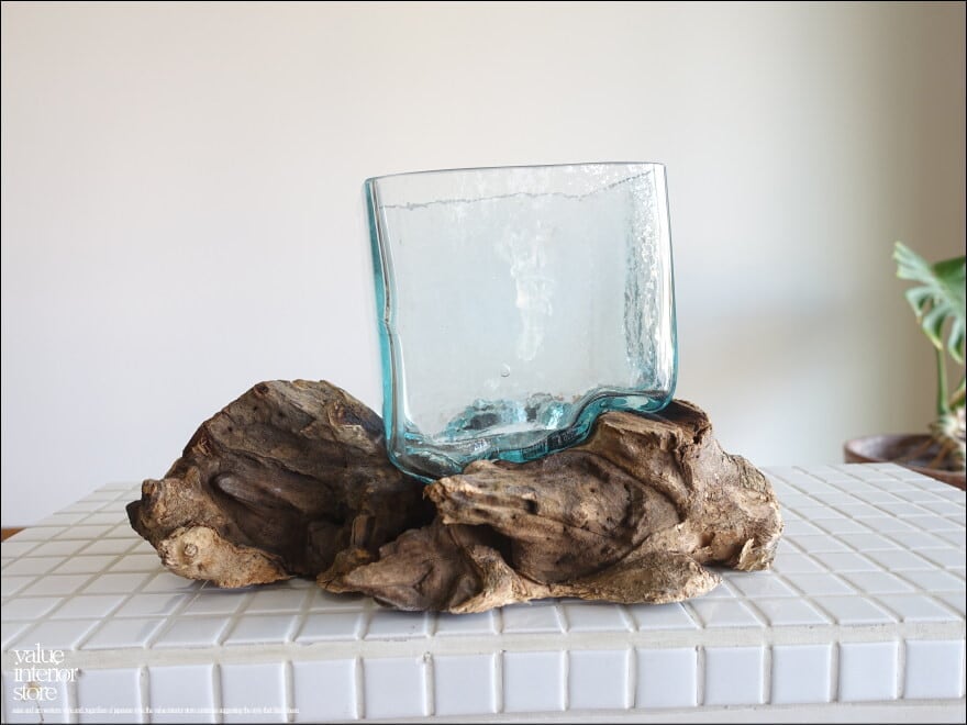 プリミティブな無垢材の土台に吹きガラスを合わせたフラワーベース。メダカ鉢にも良いサイズです。同じ形のものはなく、どちらの素材も大変個性的で味があります。