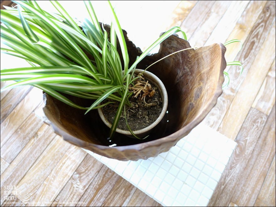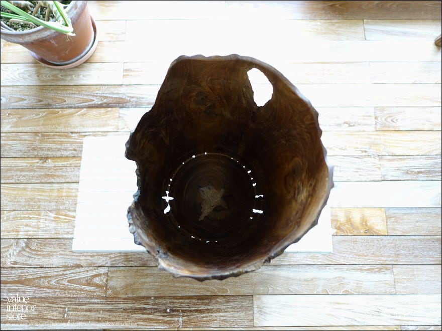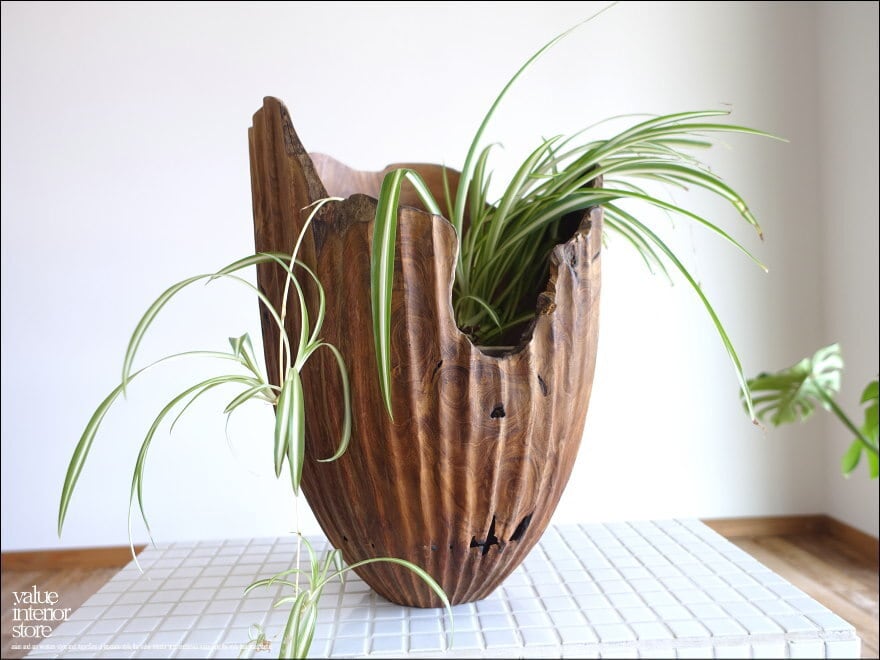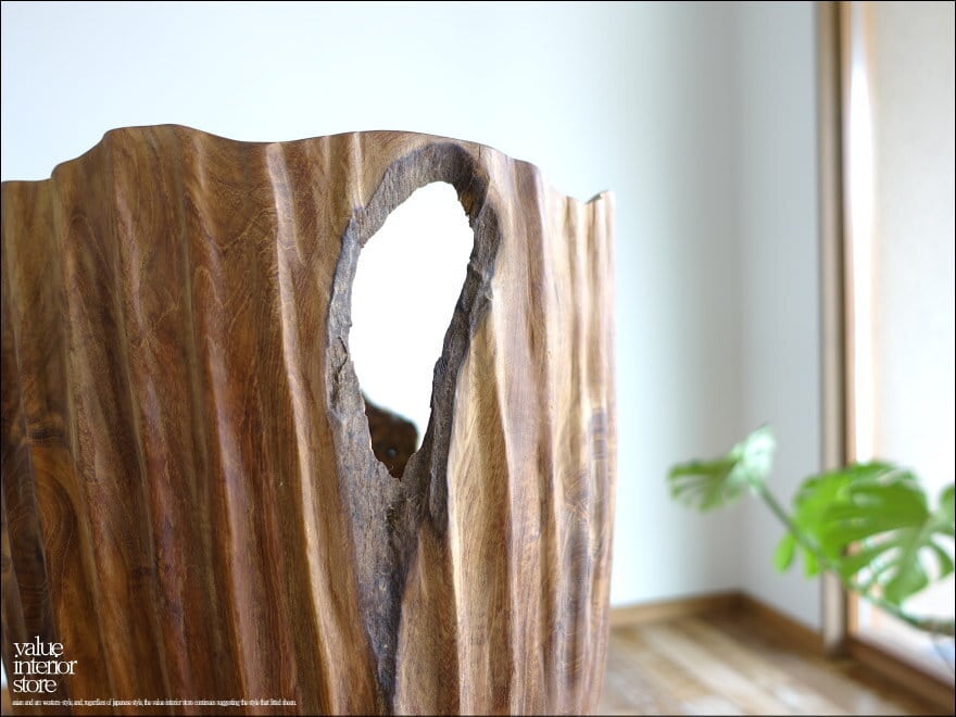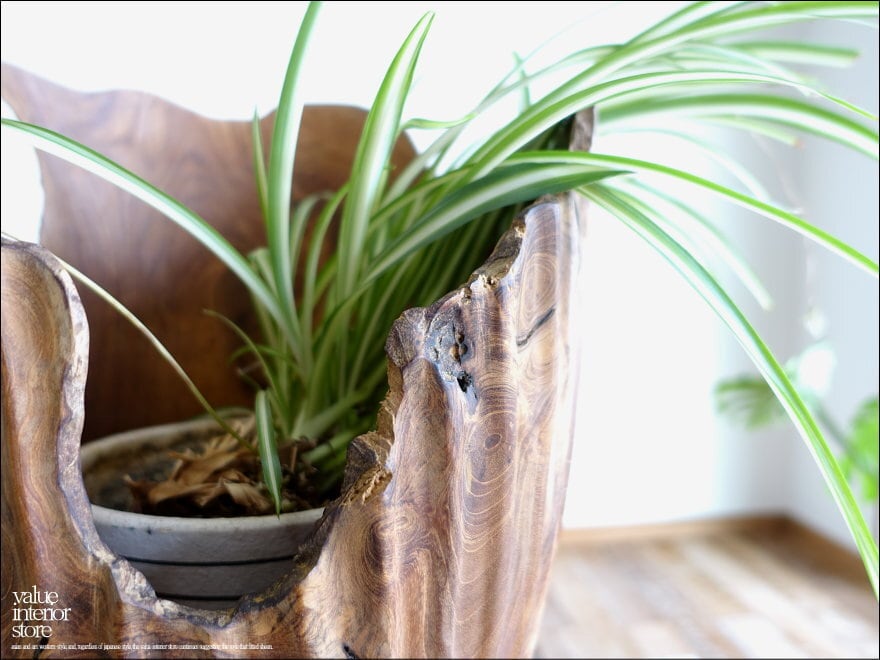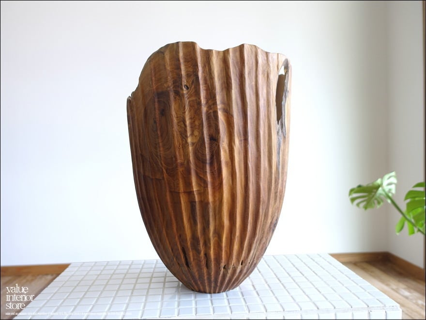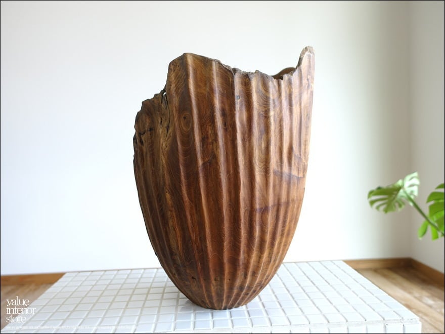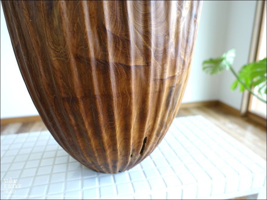 一本の丸太より削り出して製作する、自然な様の形と柔らかで変化に富んだ木肌が印象的なチーク総無垢材のプランツカバー。縦に入ったラインが底に近づくにつれてキュッと引き締まったデザインになっていて目を引きます。ここまで薄く製作ができますのも、張りを持つチーク材で乾燥状態に優れている素材だからこそのものです。