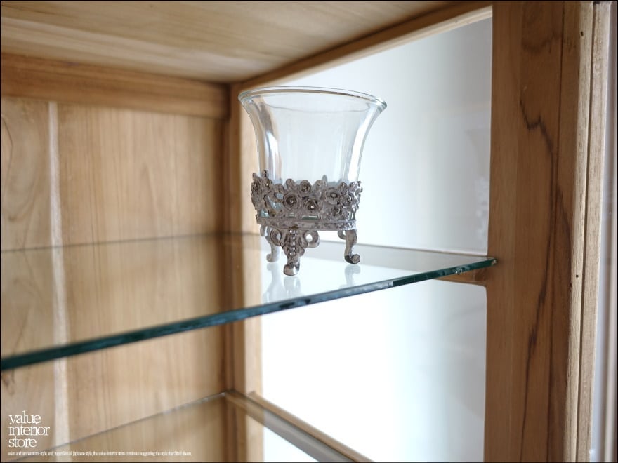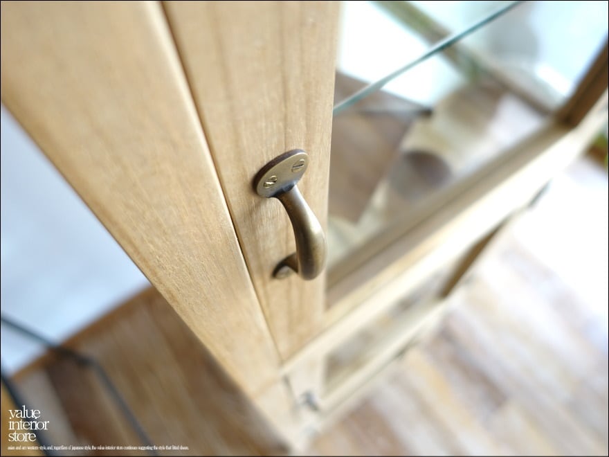昔ながらの古いパン屋さんや駄菓子屋さんにあるような可愛い三枚扉のガラスケース。取っ手と兆番は真鍮金物を使用していますので、どことなくスローダウンした暖かな雰囲気を感じさせます。合計6段の棚は収納力があり、お店やカフェなどのショーケースとして活躍します。また、食器棚や小物などの飾り棚としてもぜひお使いください。