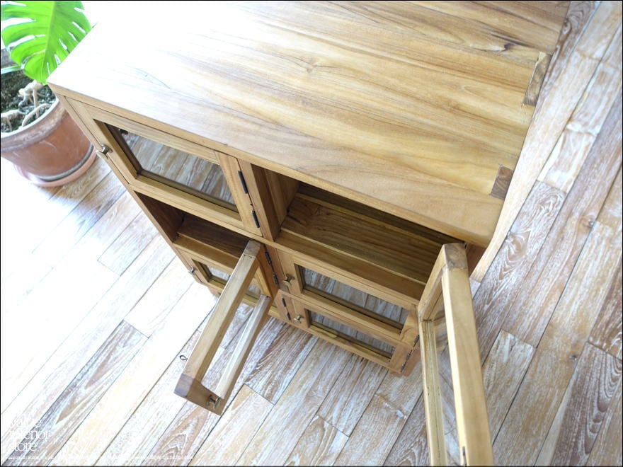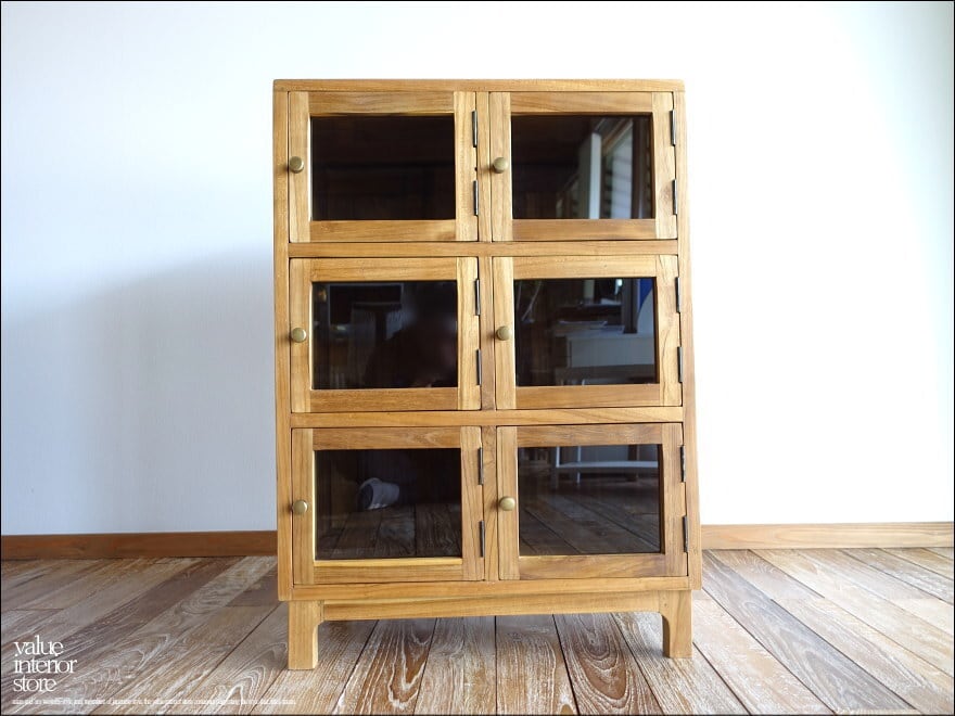 ナチュラルでチークの持つ木目の美しさが際立った無塗装の前面ガラスロッカー。
