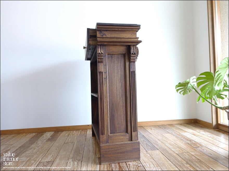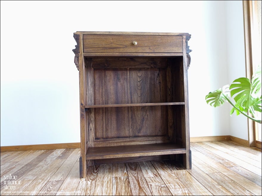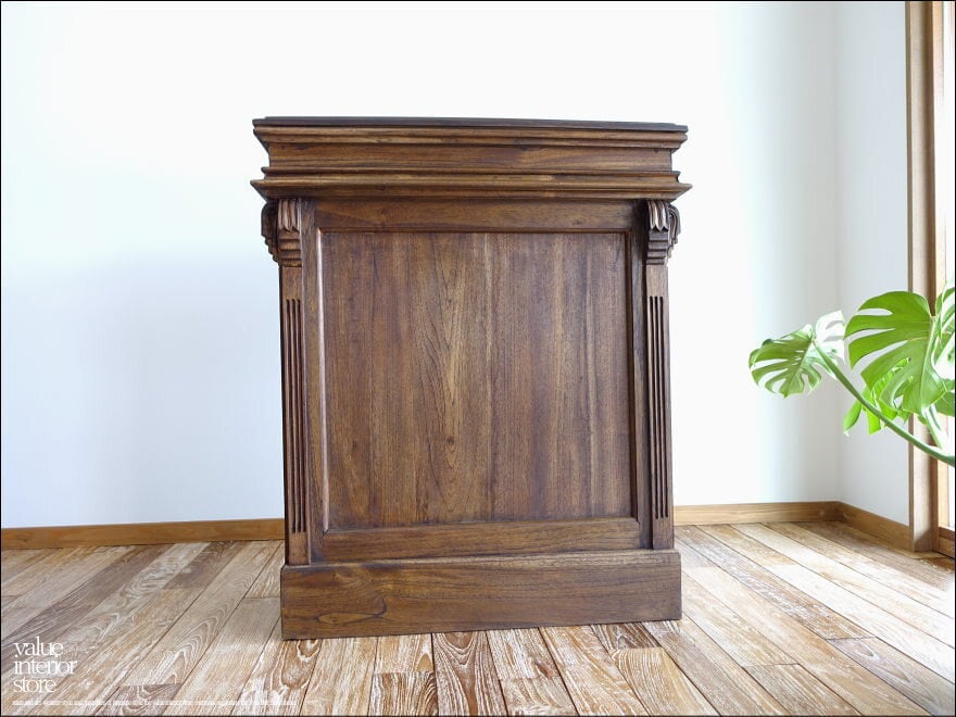 チーク材の美しい木目と質感を感じていただけます。レジカウンター、飾り台としてお使いください。引出しの取っ手には、大きめの無垢の真鍮ハンドルを使用しました。アンティークの雰囲気さえ感じられるカウンターです。雑貨店や美容室のレジ台にもどうぞ。