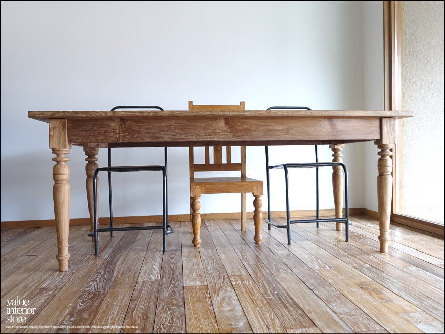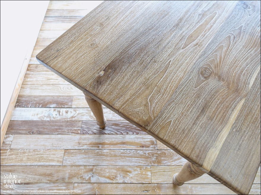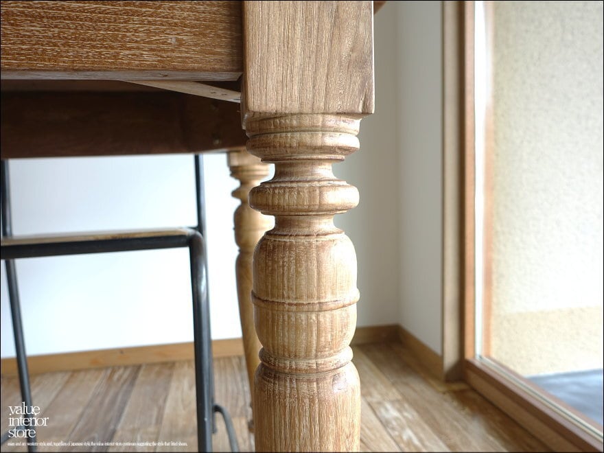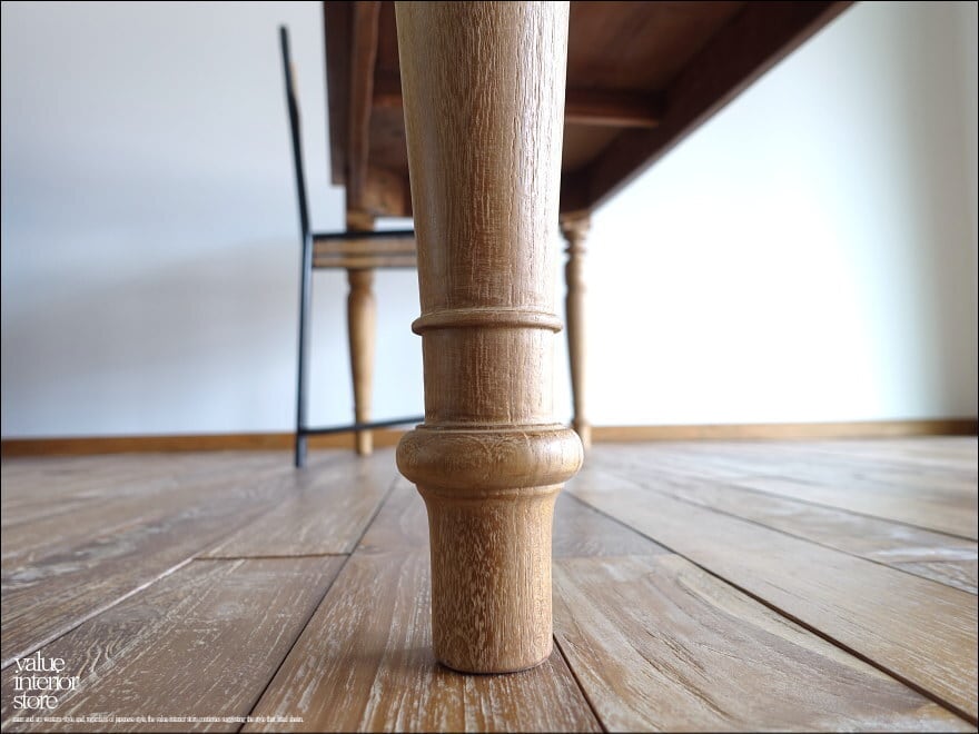 程よい太さとバランスの良いデザインの脚が心象的で、ワイヤーブラシで軽く削り取ってからサイディングする表面仕上げにより、より一層魅力的に仕上がっています。インテリアのテイストを問わず自然とお部屋の雰囲気に溶け込んでくれるテイストをどうぞお楽しみください。