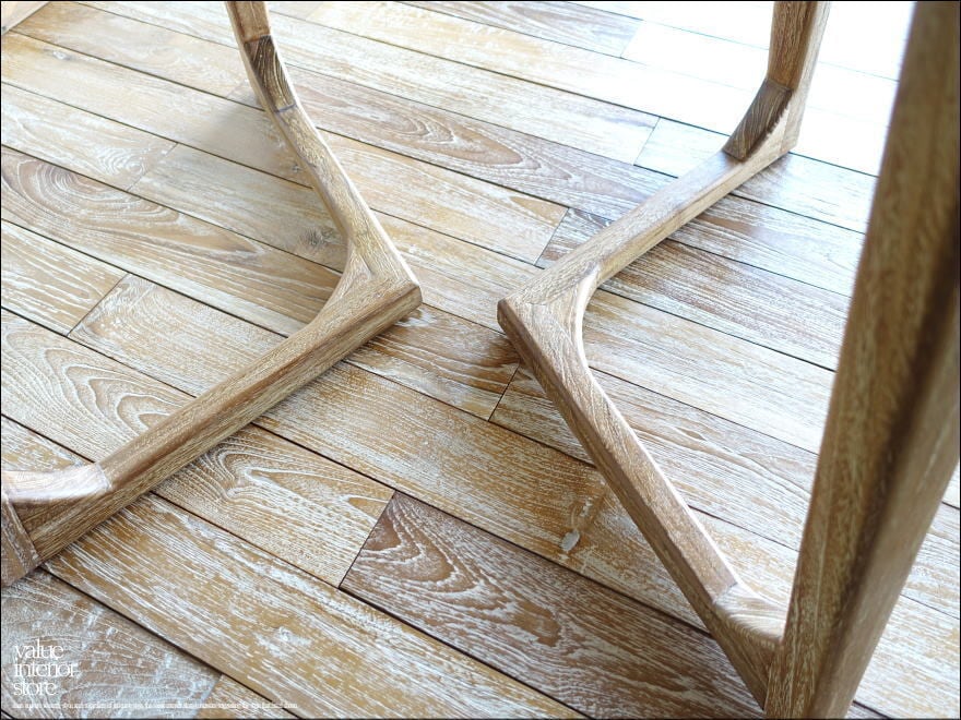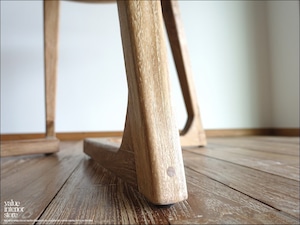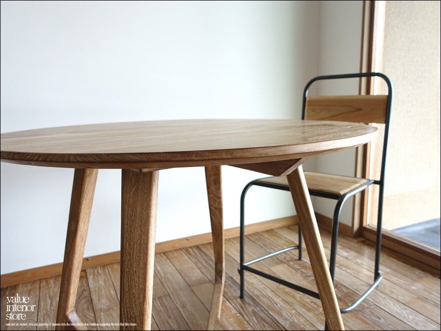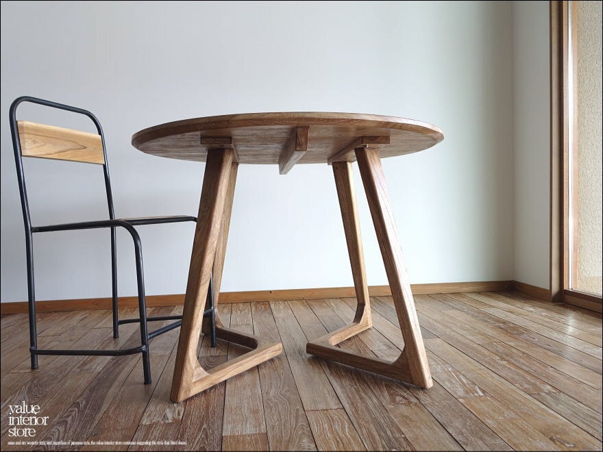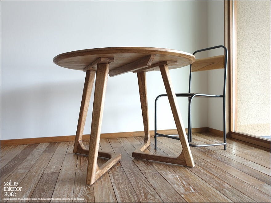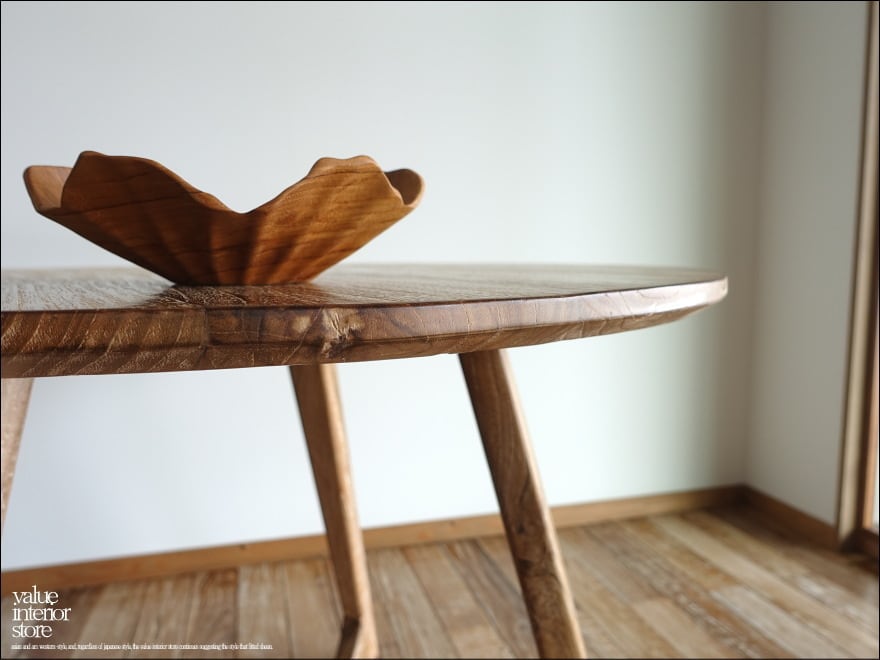 天板をバランスよく安定させるために、内側に入った脚の形状が印象的なチーク無垢材の“丸テーブルbolk“。厚みのある天板下を削ることでよりシャープでシンプルなデザインになっています。古材(オールドチーク)ならではの深みのある色合いと質感でゆっくりと落ち着いた質感をお楽しみいただけます。