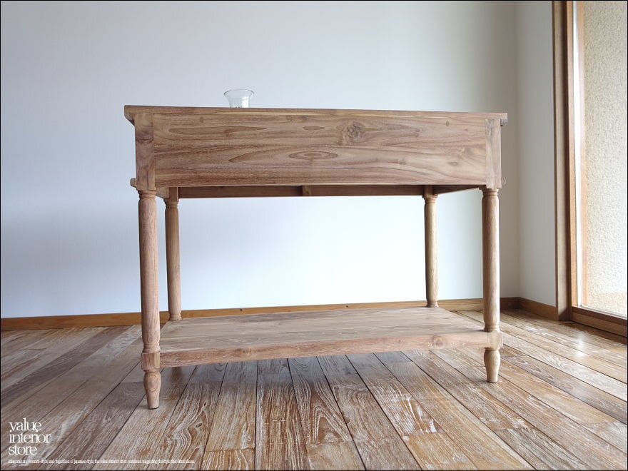 素朴な無垢材の質感が魅力的なチークカウンターADY。表面は元々の素材の色合いをベースに、ヴィンテージ調にほんのわずかグレー色を塗布していますので落ち着いた雰囲気を感じさせます。レジカウンターやコンソールテーブル、陳列台などの什器としてどうぞお使いください。