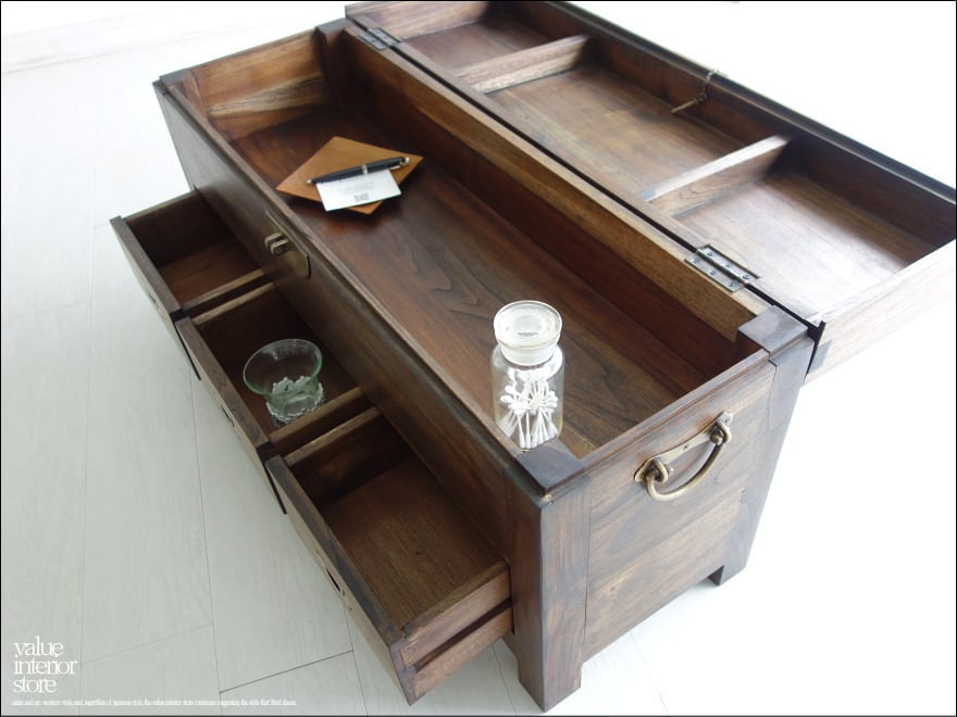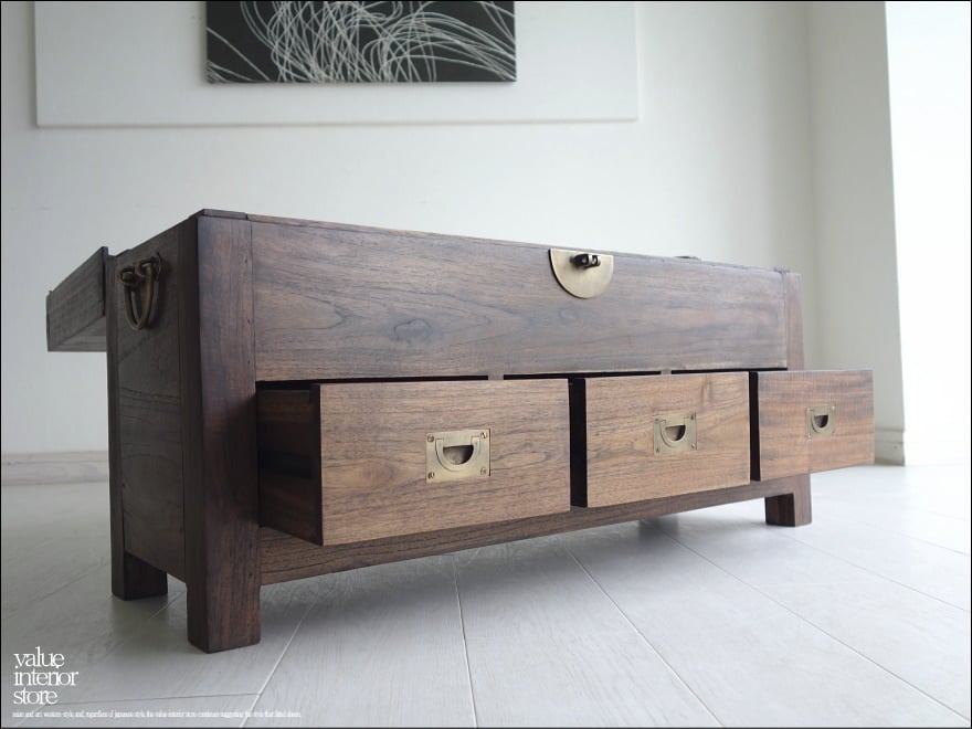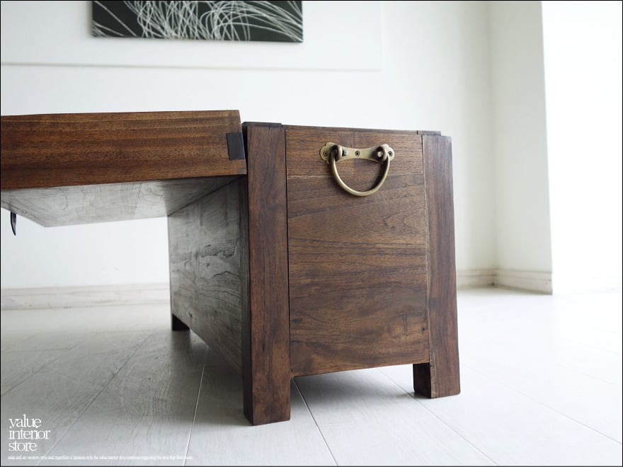 上部はトランクのような仕切りのない収納になっていて幅広のものも収納でき、細かなものは下の引き出しに分けて収納できるので便利です。シンプルながら、大人っぽく落ち着いたカラーで仕上げることで、チークの持つ張りと硬く美しい木目の特徴を引き出していて、質の良さを十分に感じさせてくれます。お気に入りスペースでお使い下さい。