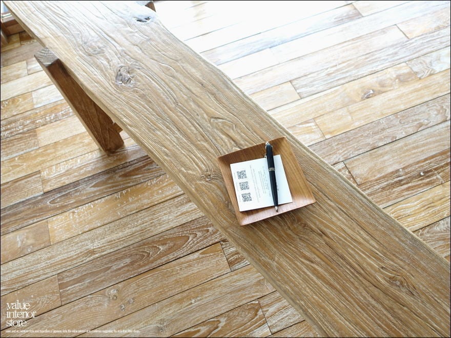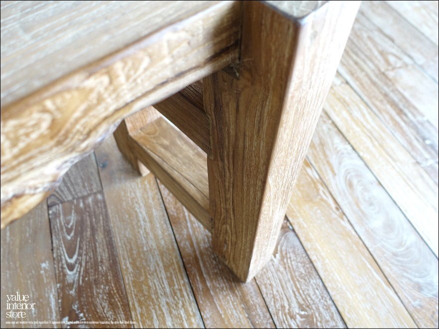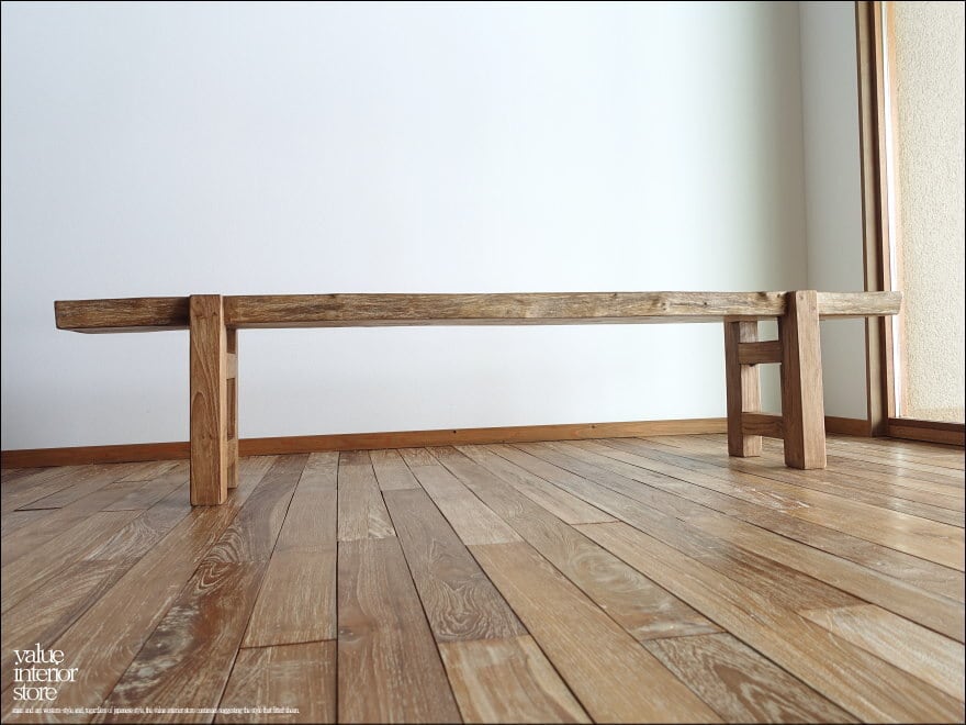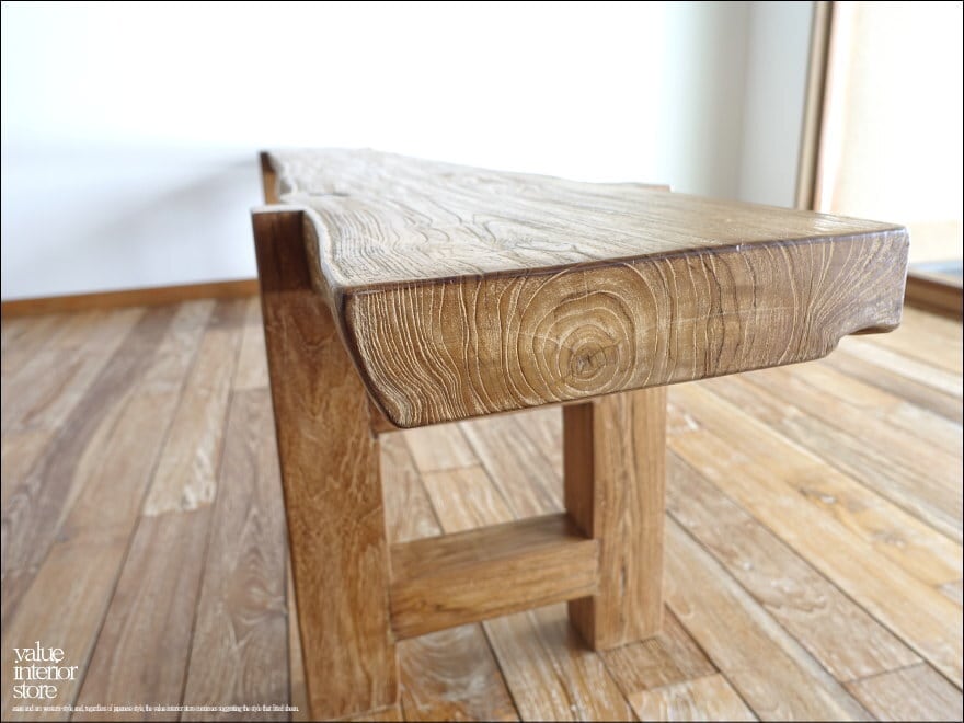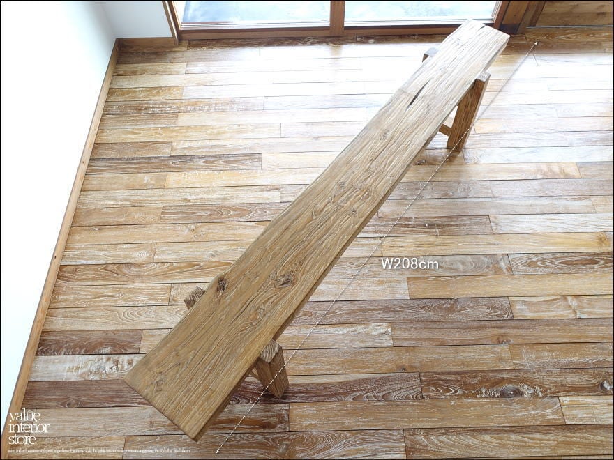 オールドチークならではの味と雰囲気を持つ横幅208cmのロングベンチ。座面は6cmもの厚みがあり、素材ならではの張りと硬さを感じていただけて、オールドチーク表面の荒々しさと変化に富んだ木肌が全体的に見られます。ゆったりとしたお部屋の雰囲気づくりにぜひお役立てください。