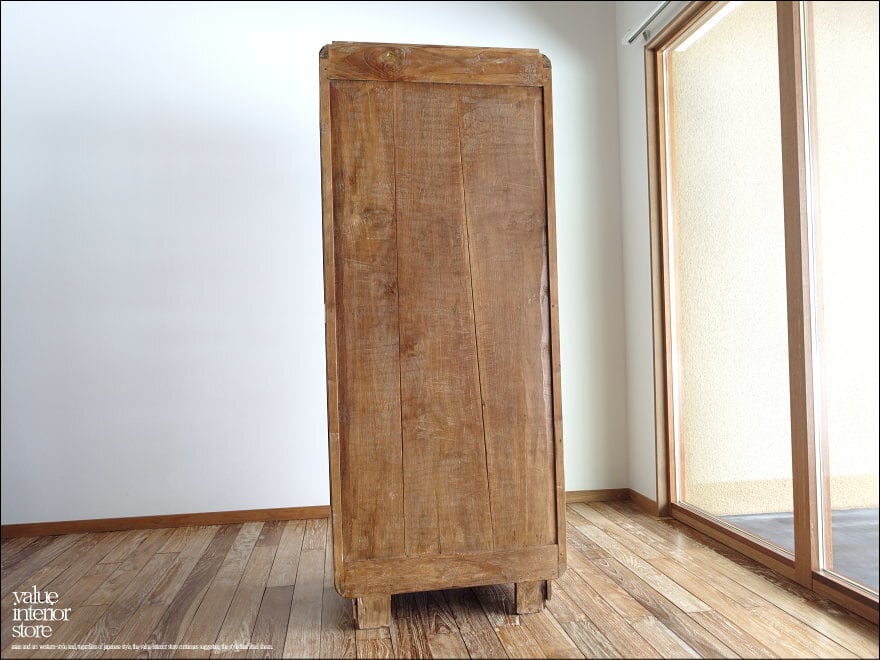 古い歴史を感じさせる佇まいが魅力のチーク総無垢のアンティークキャビネット。