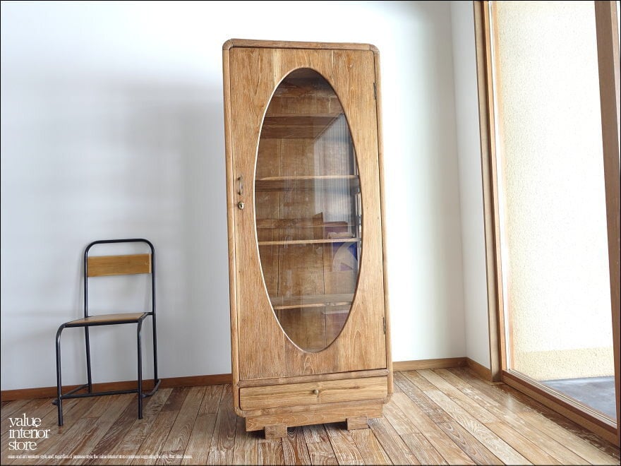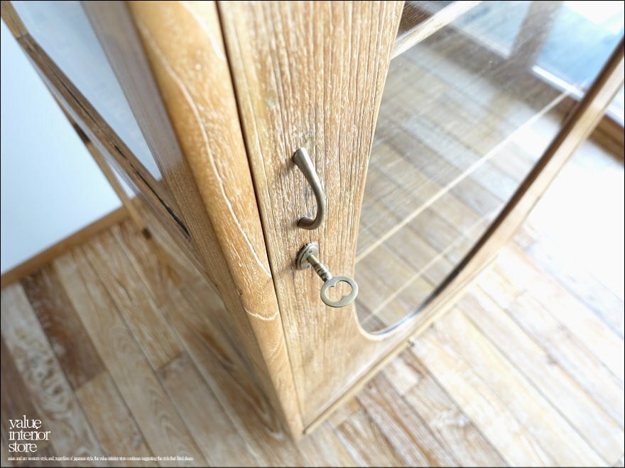 存在感のある大きさで奥行きもたっぷりあるのでキッチンの食器棚としてもリビングの収納棚としても便利にお使いいただけます。扉はガラスなのでディスプレイするような感覚で中に入れるものにもこだわりたくなります。扉は真鍮鍵付き。鍵がとても可愛らしく、きちんと機能しています。全体的に素朴で落ち着いた色合いでシックな雰囲気を残した表面処理(ワイヤーブラシで表面を削るラスティック仕上げ)になっています。カフェやショップなどの什器として食器棚、本棚、収納棚などにもおすすめです。