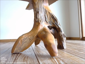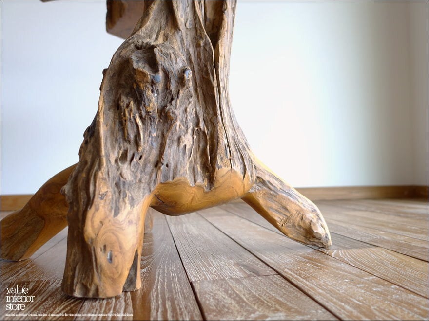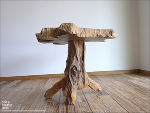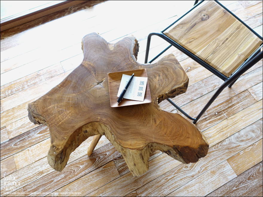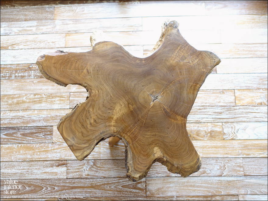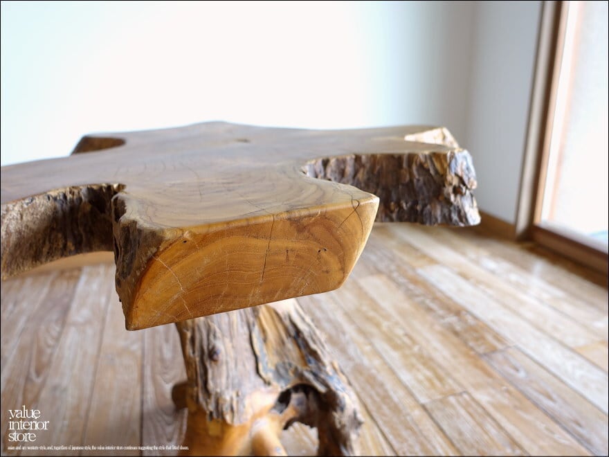 自然な様の一枚板を天板に使用したチーク無垢材のテーブル。素朴で癒される雰囲気があります。