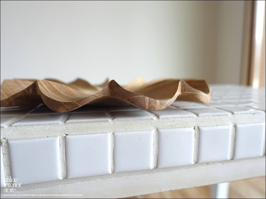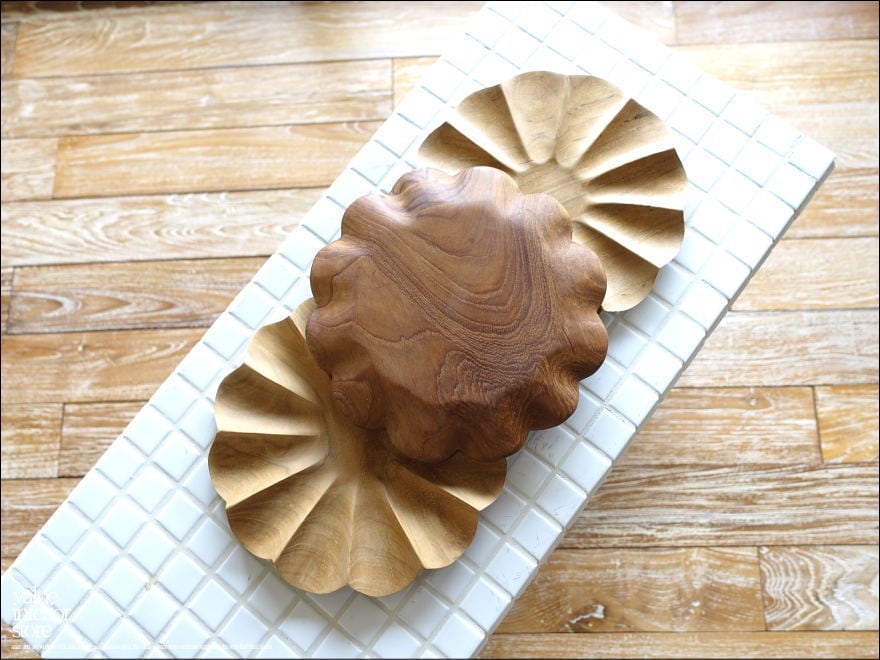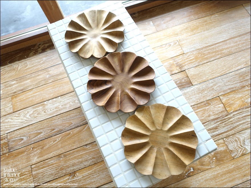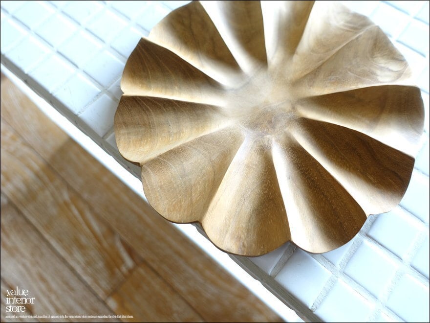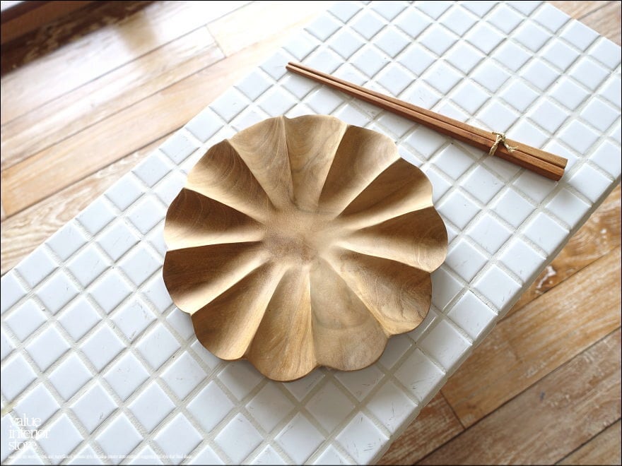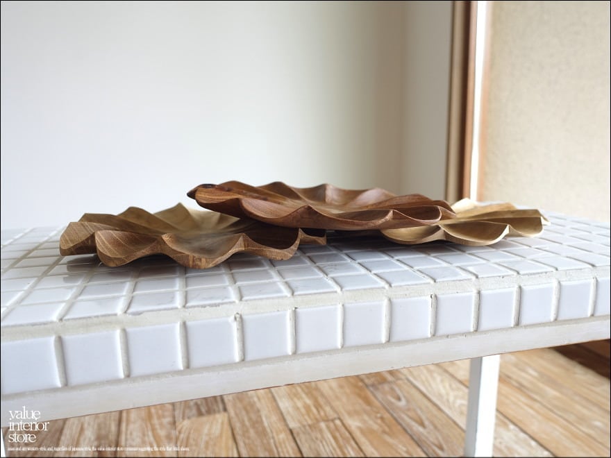 外側に向けて広がりを持たせるデザインが素敵なチーク無垢材プレート“zwol” 一つ一つチーク材独特の個性的な木肌が見受けられ、素朴で暖かみを感じさせます。食器のプレートや小物入れとしてお使いください。