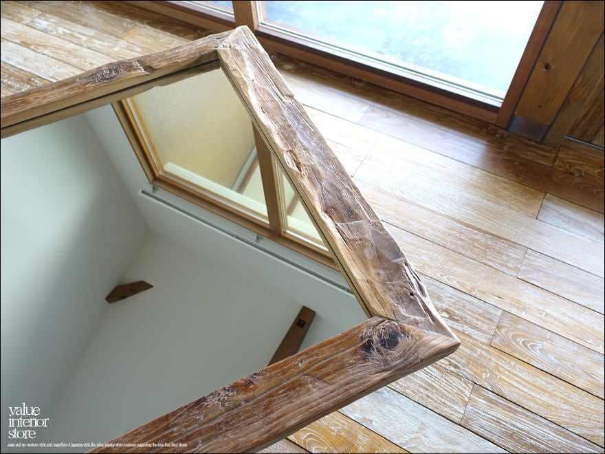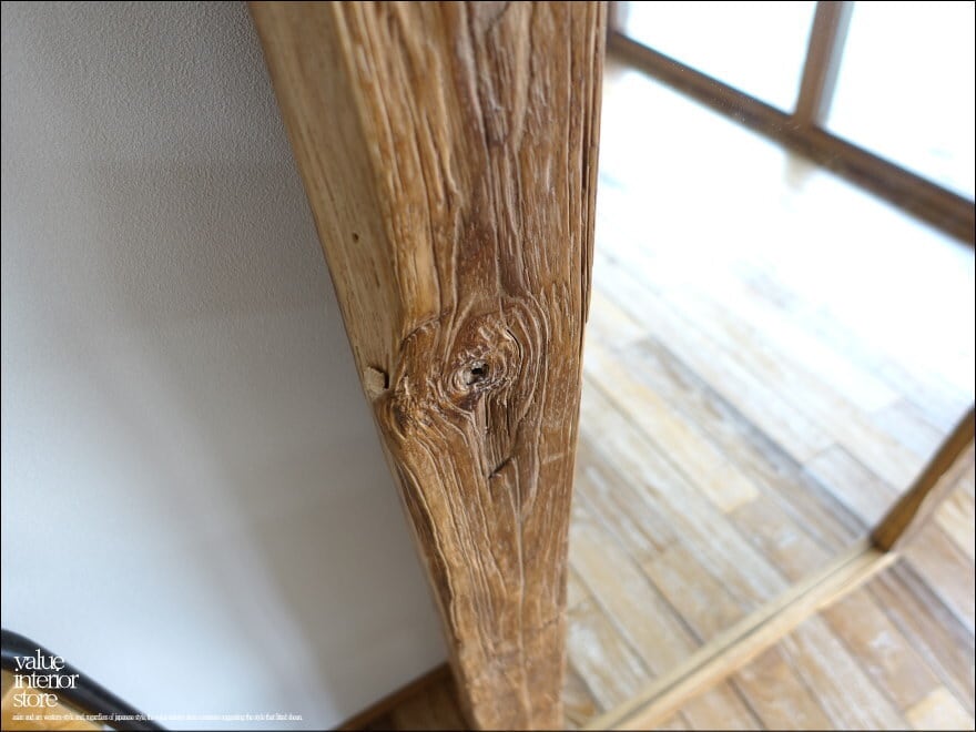 プリミティブなオールドチークならではの個性的なミラー。全身を映せる大きめサイズの姿見です。プリミティブな質感をそのままに仕上げて、深みのある色合いが魅力で、空間を暖か味のある雰囲気に演出してくれます。フレーム裏面縦方向に2箇所壁掛け用の穴がありますので壁にビスを設置して頂き引っ掛けるか、安全な場所に立掛けてご使用下さい。