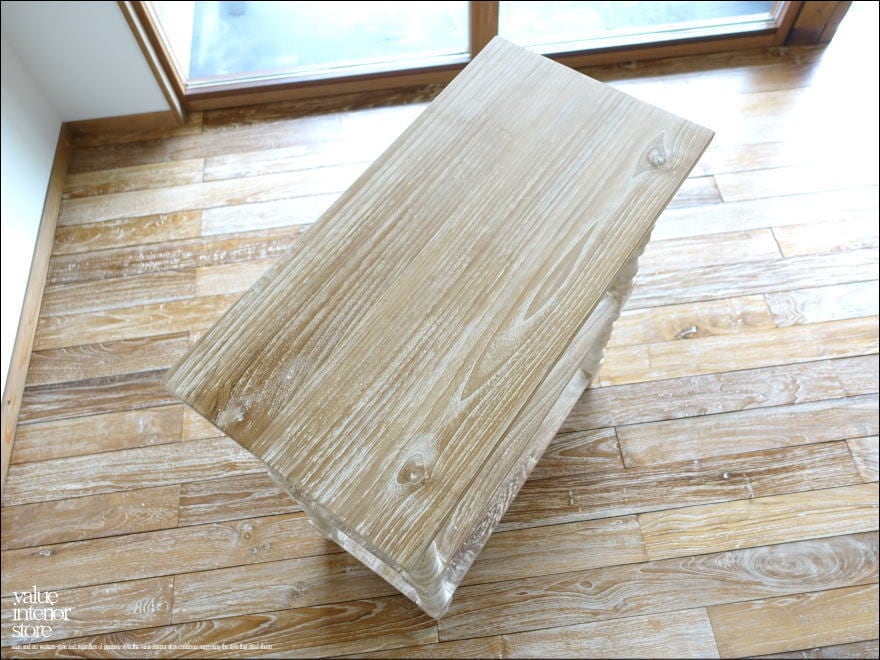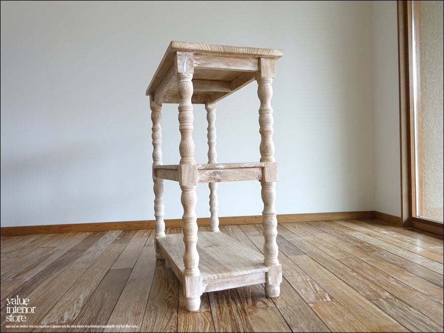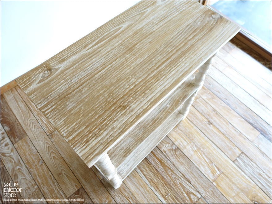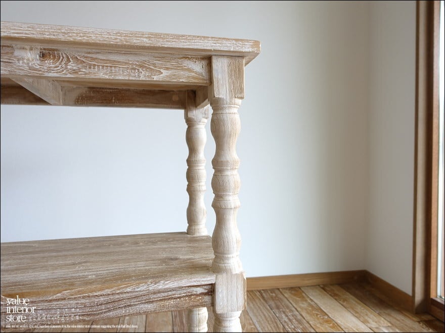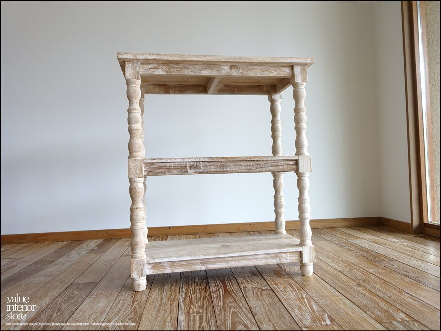 表面は凹みに白色を薄く残したナチュラルホワイト仕上げ。表面仕上げに一工夫することで、一層素朴で明るい雰囲気に仕上がりました。余分な装飾を無くしたシンプルな棚板と、丸く柔らかな印象の脚とのバランスがとってもかわいいですよ。きっとお部屋を素敵な雰囲気に包んでくれます。