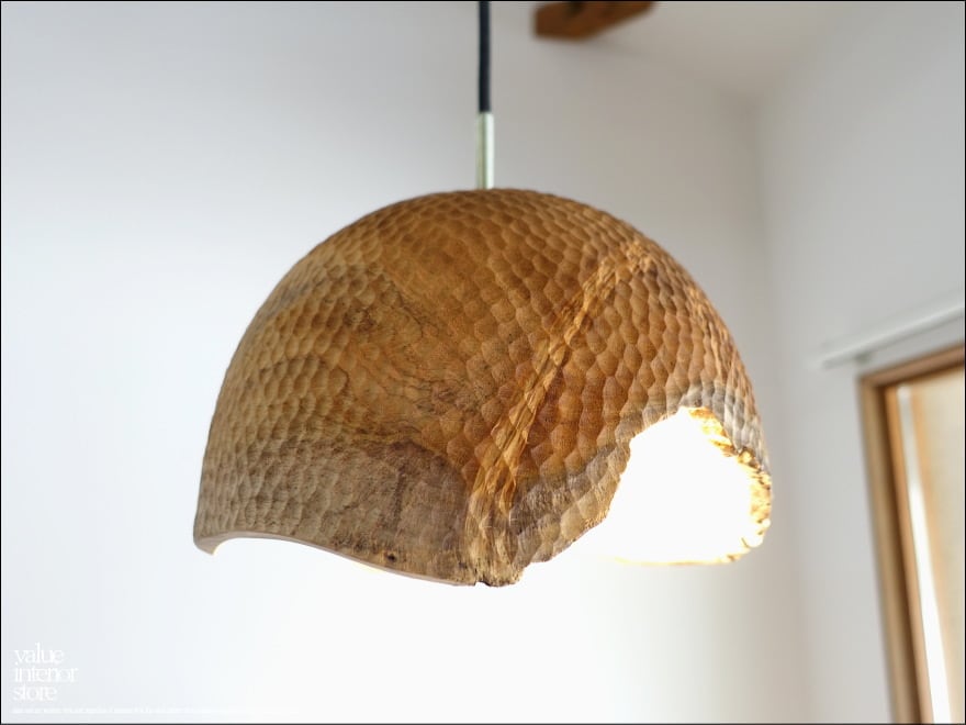 プリミティブな無垢材シェードの表面に手彫りで凹凸をつけた飾りが、何とも雰囲気があり、温かみを感じさせてくれます。空間のアクセントづくりにどうぞお役立てください。天井電源コネクターは、一般家庭用の引っ掛けシーリングタイプ(安全ストッパー付き)。・コードは長さ調節不可。電源は壁スイッチ操作。