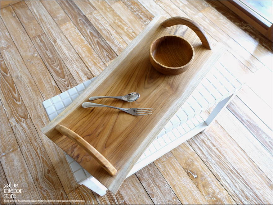 ナチュラルなチーク材の変化に富んだ形と木目が素敵なサービングトレイ。