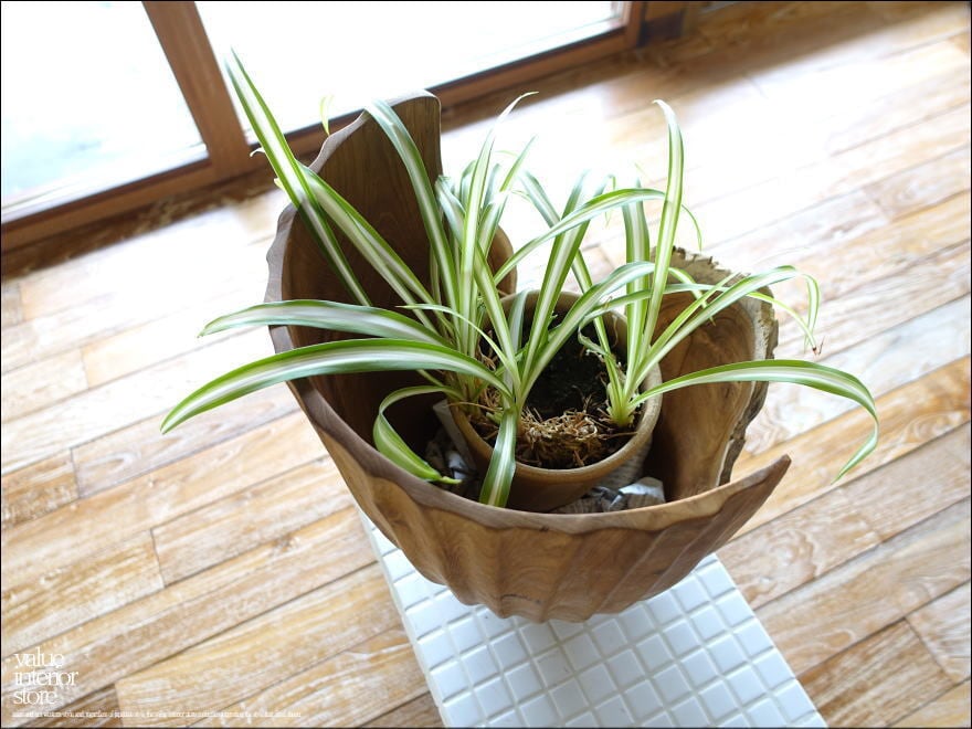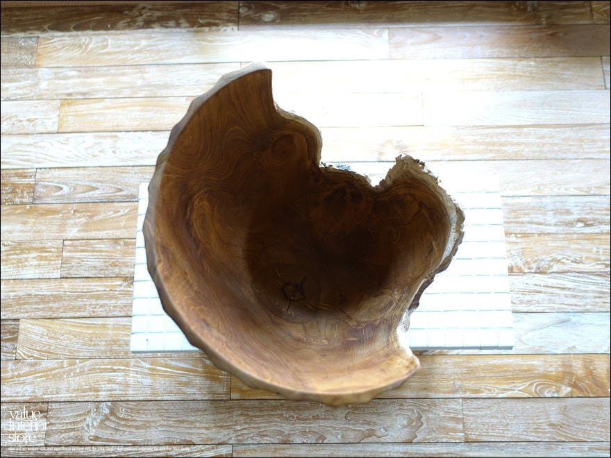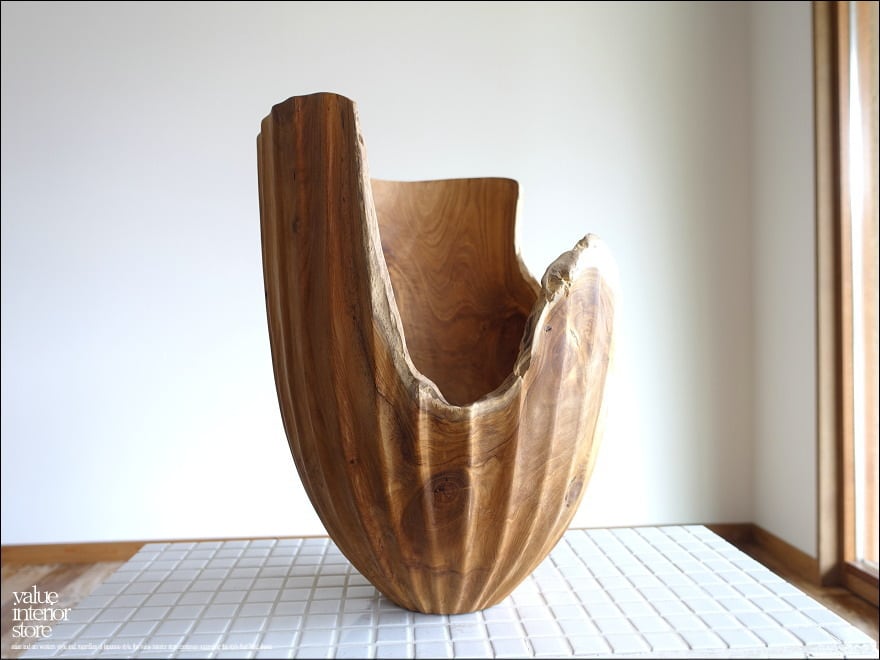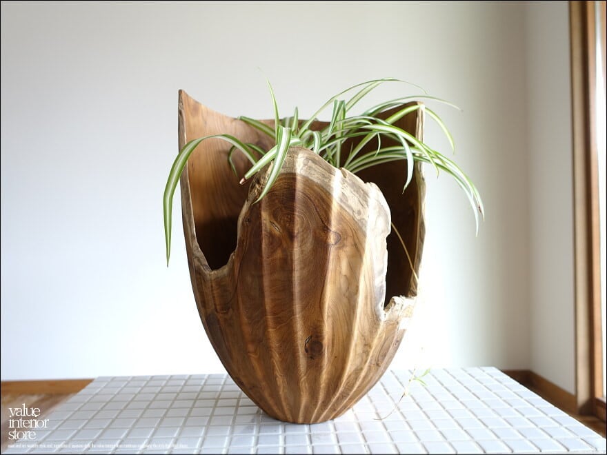 一本の丸太より削り出して製作する、自然な様の形と柔らかで変化に富んだ木肌が印象的なチーク総無垢材のプランツカバー。縦に入ったラインが底に近づくにつれてキュッと引き締まったデザインになっていて目を引きます。ここまで薄く製作ができますのも、張りを持つチーク材で乾燥状態に優れている素材だからこそのものです。
